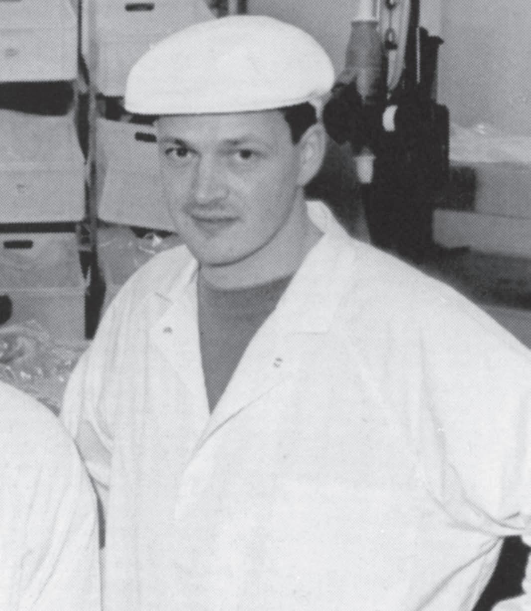 Roland maakte lange dagen. Hele dagen duurden zo’n twaalf uur. Zaterdagen golden als halve dagen. Dat betekende dat hij van 06.00 uur ’s ochtends tot één uur ’s middags werkte. Zeven uur is best lang voor een halve werkdag! Vanaf zijn 23e stapte Roland fulltime in het bedrijf van zijn vader en broer. De overgang – van zijn heao-studie naar de productielijnen in de fabriek in Eersel – kon niet veel groter zijn. De eerste anderhalf jaar hield hij zich bezig met uitbenen, snijden, portioneren, gehakt draaien. Daarna acht, negen maanden in de gehaktkeuken bij Gerrie Cox. Zes dagen in de week, van half zes ’s ochtends tot vaak een uur of zeven, acht ’s avonds. Het waren tropenjaren.