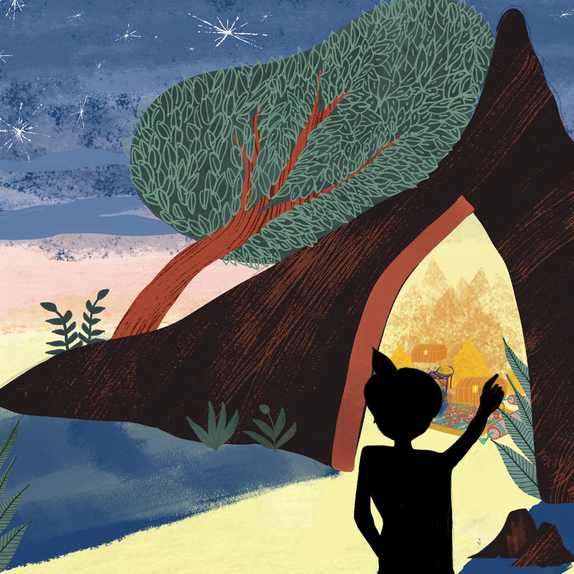 Wonder boven wonder opende de grot zich. Zonder dat Ali Baba goed kon zien wat er in de grot verscholen zat, zag hij een felle schittering.