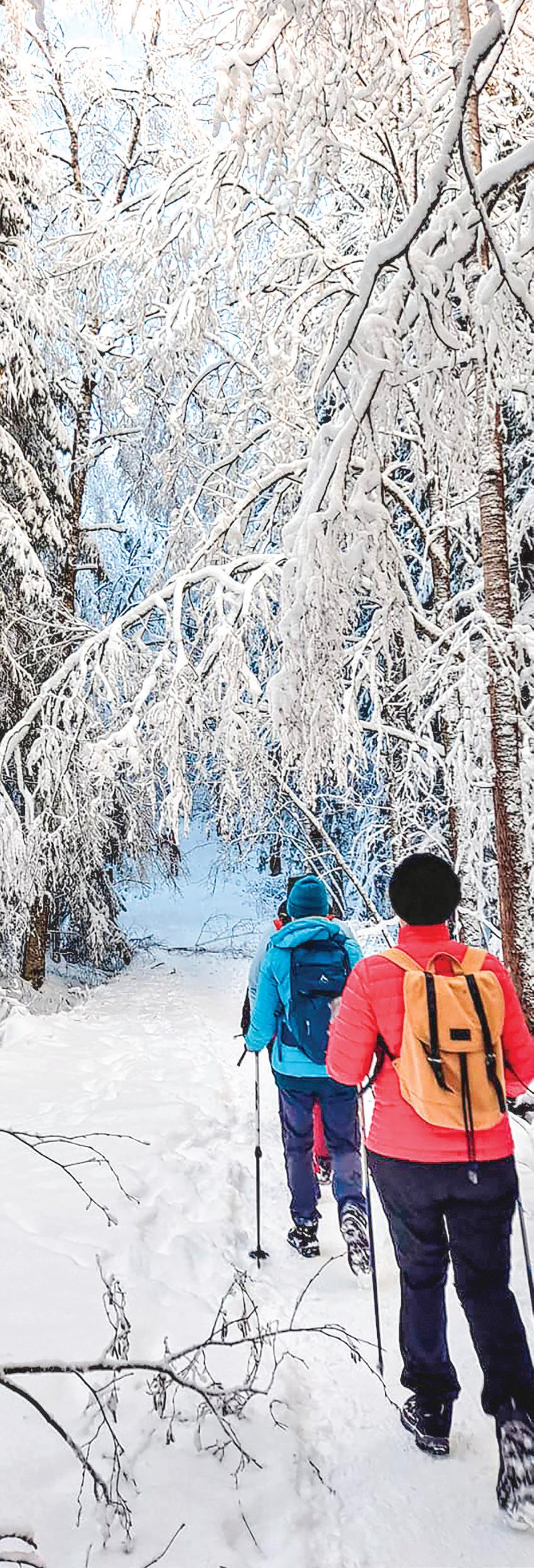 matka etenee osallistujien vauhdin ja kunnon mukaisesti. Mukaan tarvitset kävelyyn soveltuvat jalkineet, säänmukaisen asun sekä omat sauvat. Pakkasraja -15 ºC.