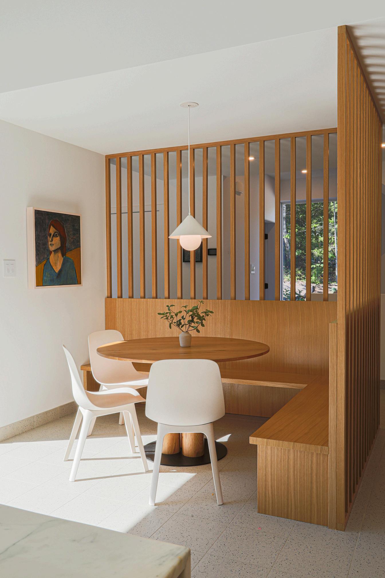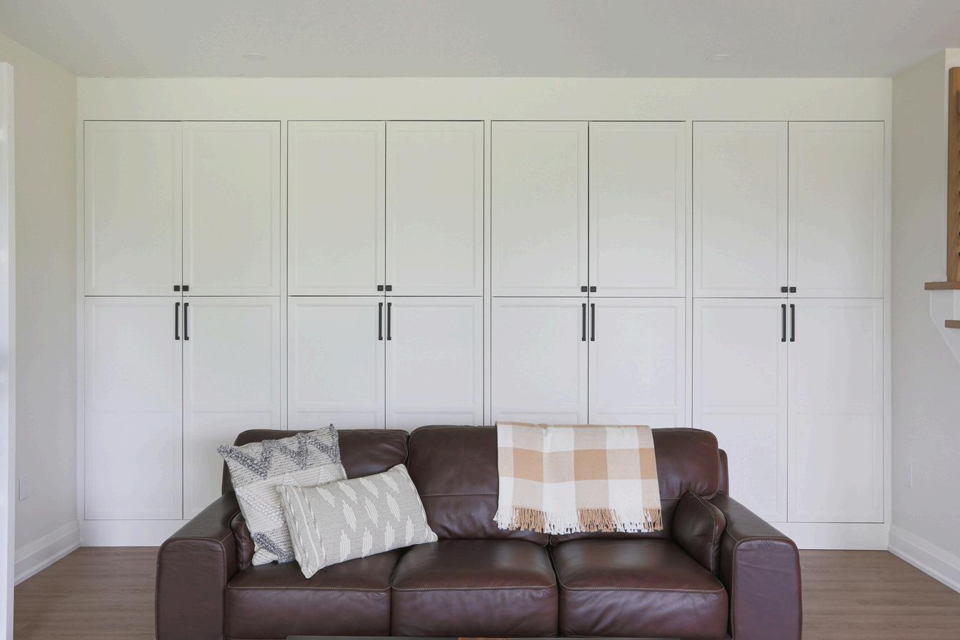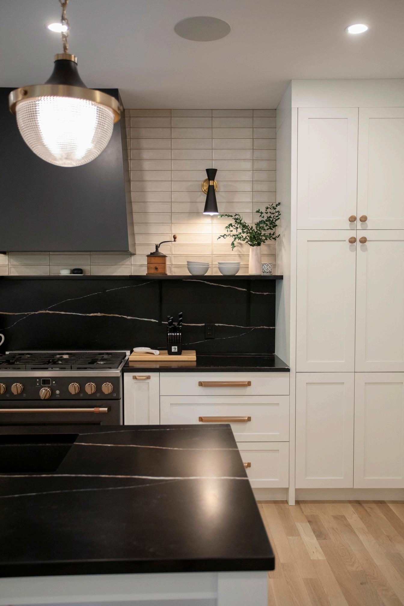 One of the most challenging tasks during the build was the kitchen layout. It was big, but not big enough to host a kitchen island AND achieve the functional kitchen work triangle. The clients were enthusiastically game for a peninsula and even decided to make it stand out with a custom white oak slated backing.
