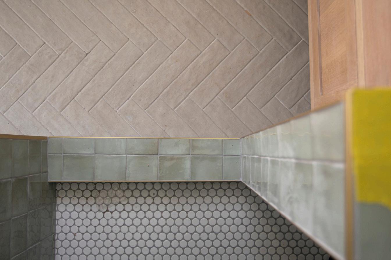 Wall-to-wall durability for the upcoming splash zone of a pool house bathroom. Tons of texture, tones and tact in this room’s base layer. Soon to come- the icing of accessories.