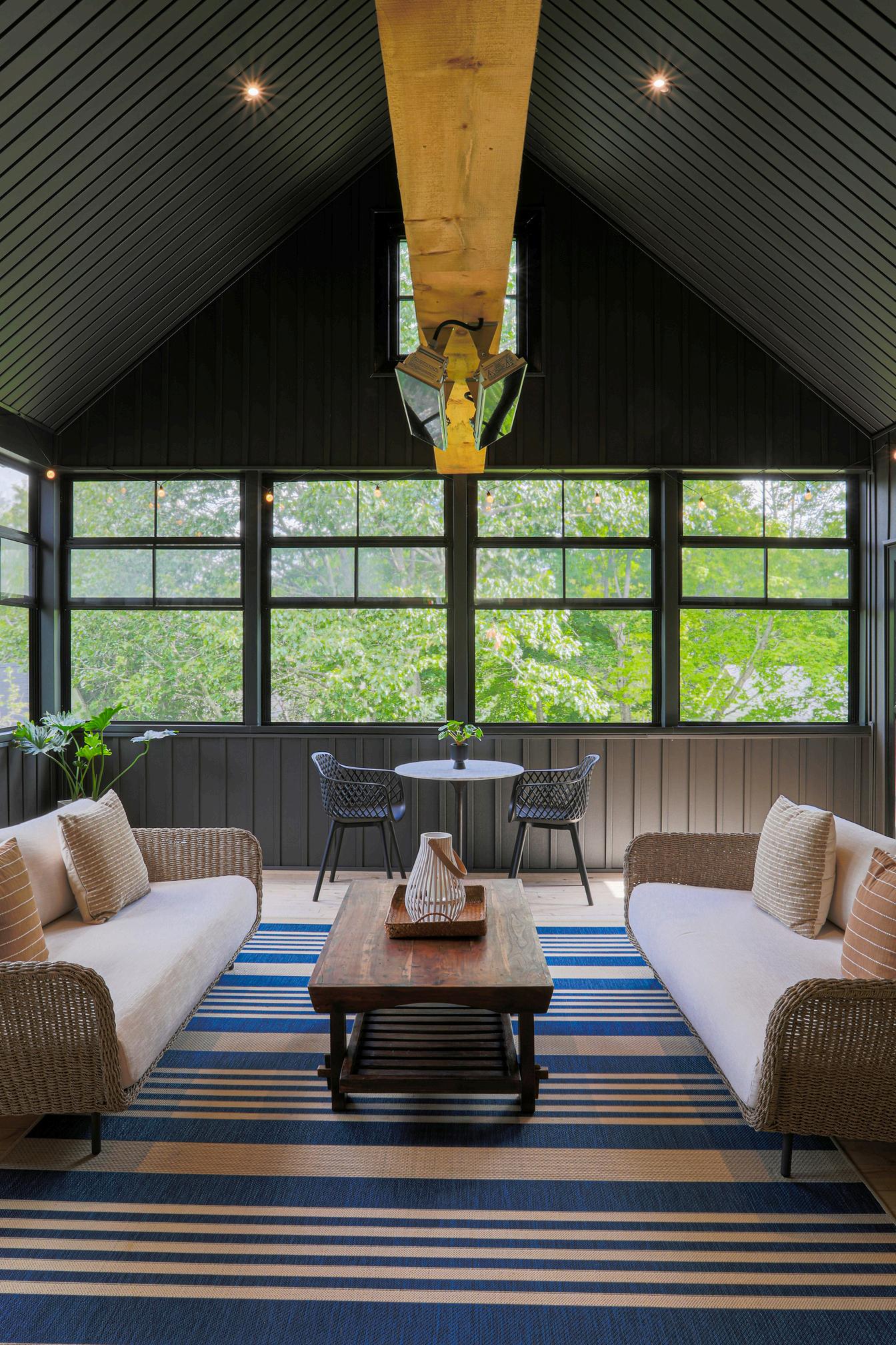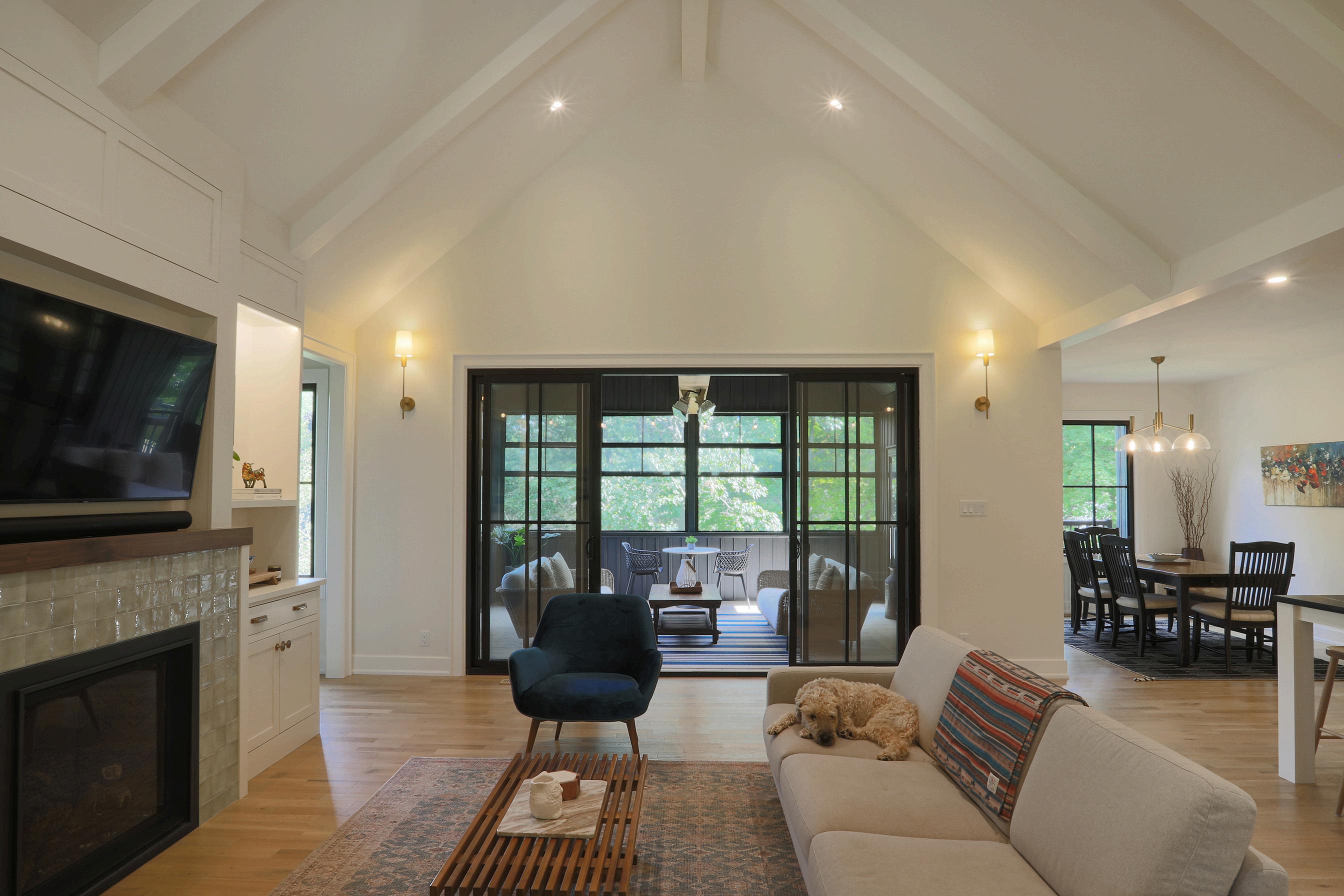 The screened-in porch mirrors as invigorating to entertain within and restorative to read within. Framed by the infill lot hardwoods and an old barn out back that was kept as part of this new build project.