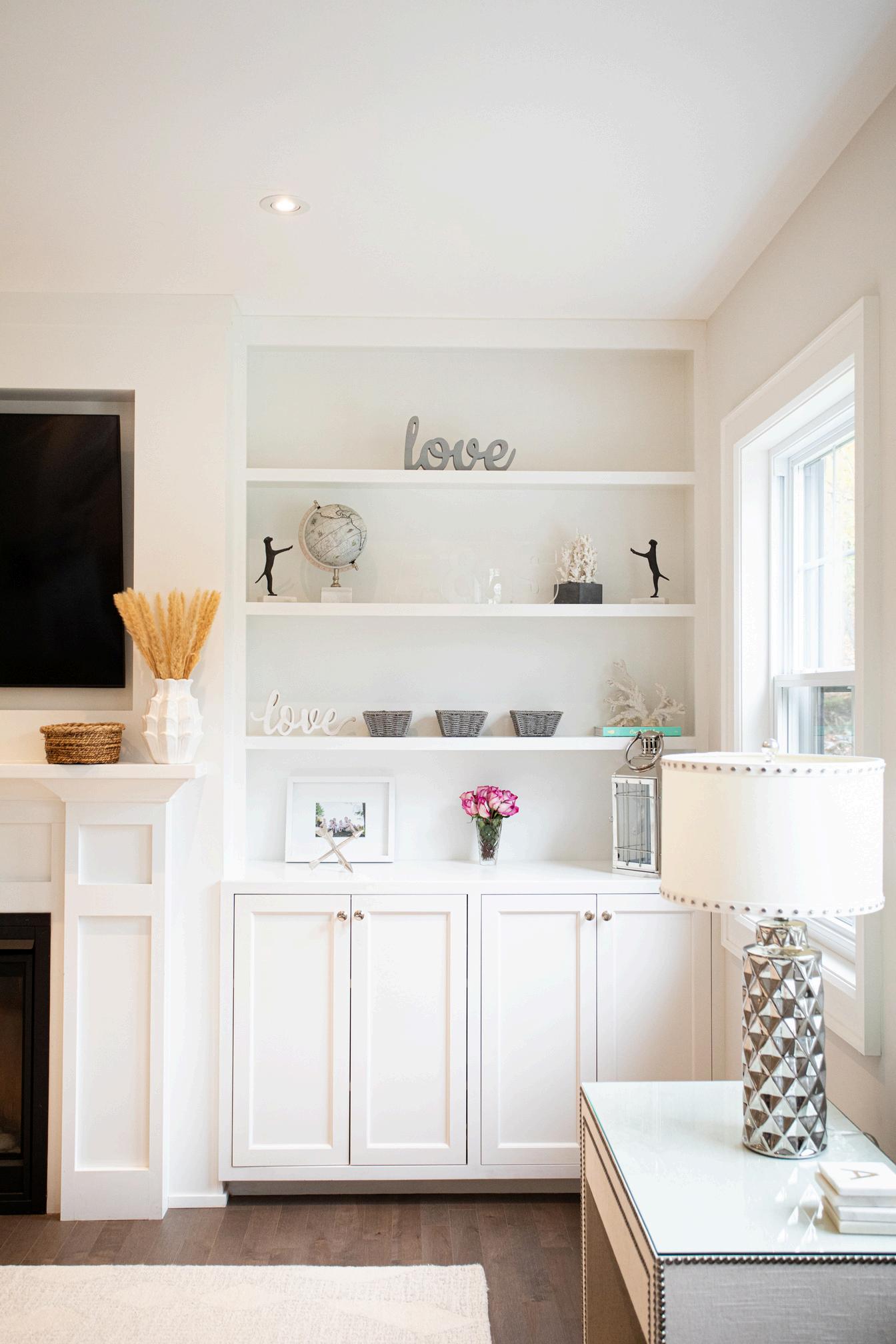 The living room provides an excellent vantage point of the main level and is anchored by an oversized yet scaled built-in with such satisfying storage and high-end gas fireplace. Custom inset built-ins and bookshelves throughout offer attractive yet functional storage options.