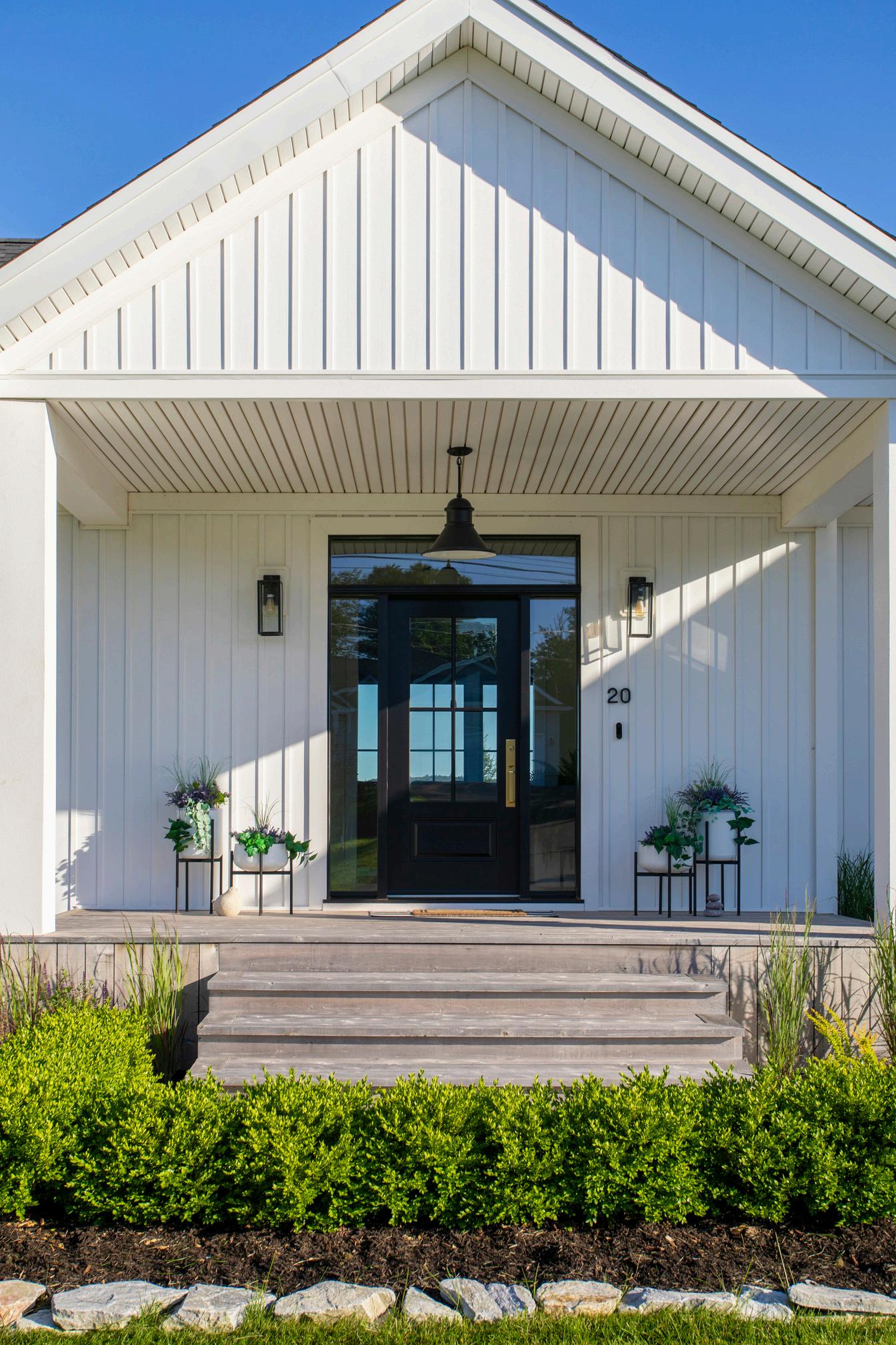 A stunning white home with black windows and doors that will never go out of style.