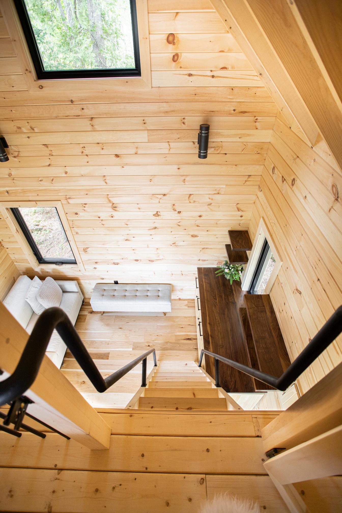 Tongue & groove hemlock and pine boards line the shelter’s interior. An impactful pair of black railings reach skywards to wrap around the loft’s edge. The space here is sized comfortably for a bed, tucked against a custom built-in headboard lined with nooks. On the exterior, exposed rafter tails give the bunkie its clean classic appeal.