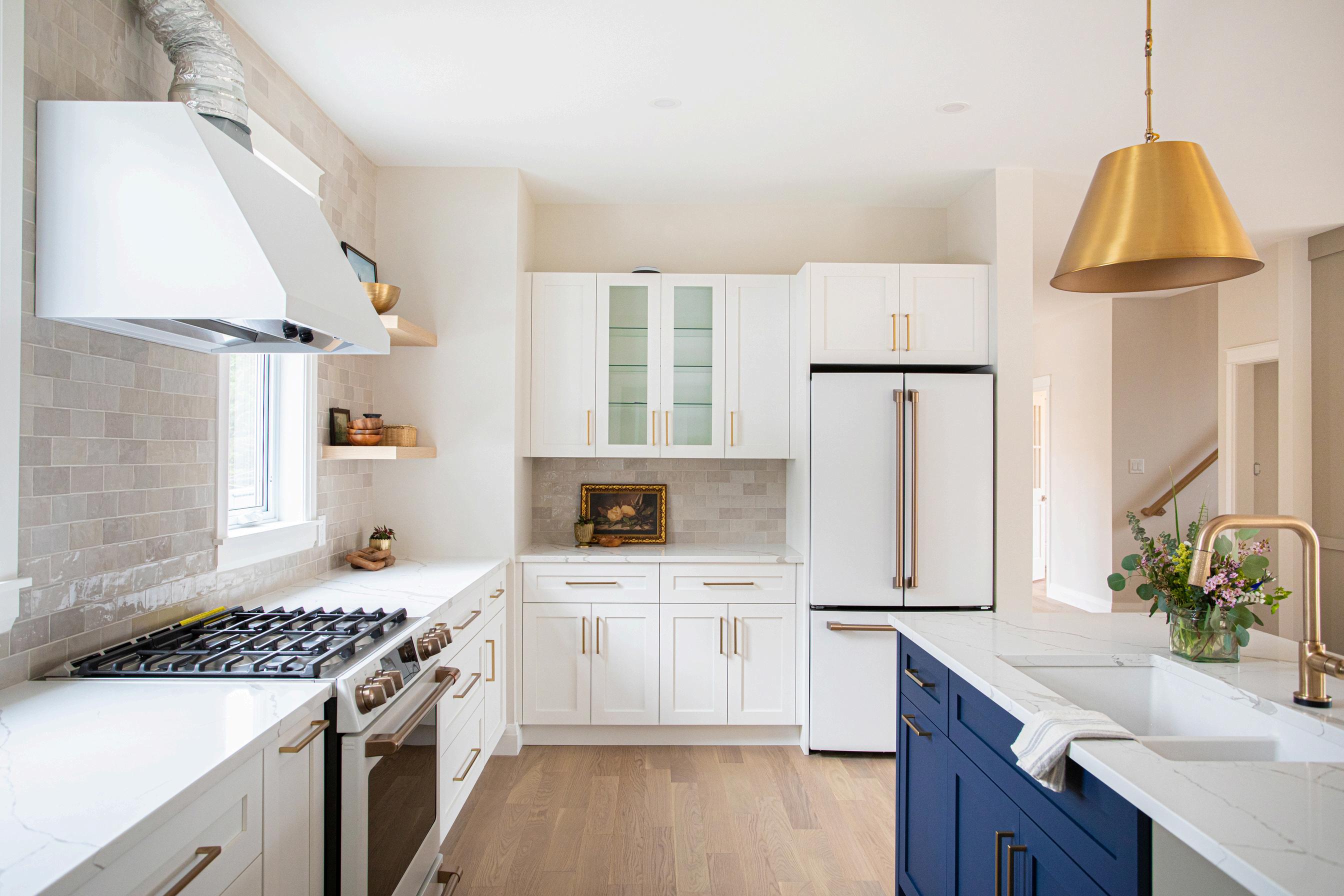 The kitchen is fitted to fill with family and guests on any milestone, holiday or occasion. The island is 8 feet of well used space, painted in Benjamin Moore Hale Navy along with custom cabinetry.
