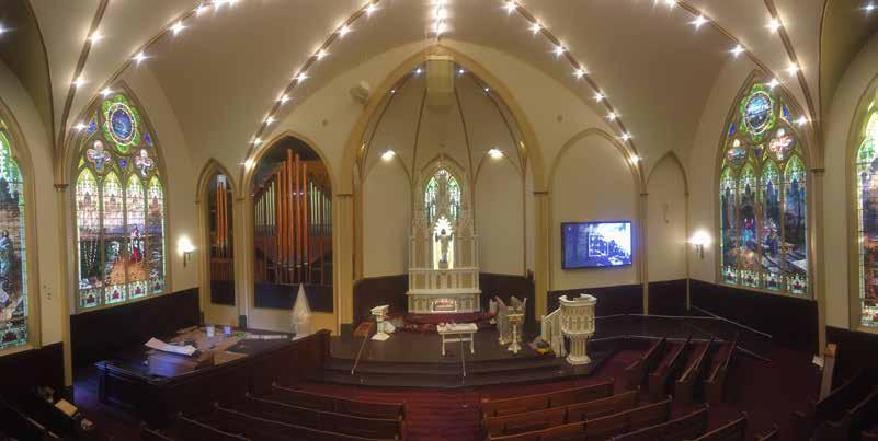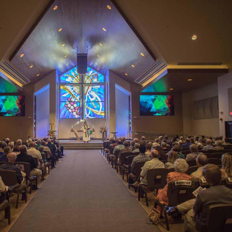 • We worked closely with Barco and the project millwork contractor to integrate a 3.9 mil LED wall to overcome the ambient light from the stained glass windows and to lower maintenance expense.