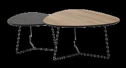 2-delige tafelset uitgevoerd met sterk en krasvast HPL blad. Onderstel van zwart metaal. Rond of driehoekvorm (diverse kleuren).