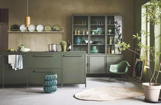 Heb je een open keuken en dol op groen? Pas dan verschillende groentinten toe in de hele ruime. Oók op strakke materialen, zoals een mat metalen keuken, keramiek en glaswerk. Van groen krijg je nooit genoeg. ‘Groen doet wat met je. Net als een wandeling in het bos. De natuur, ook de verwijzing ernaar zorgt voor een rustgevende sfeer. Dit is een trend waar je van oplaadt.’