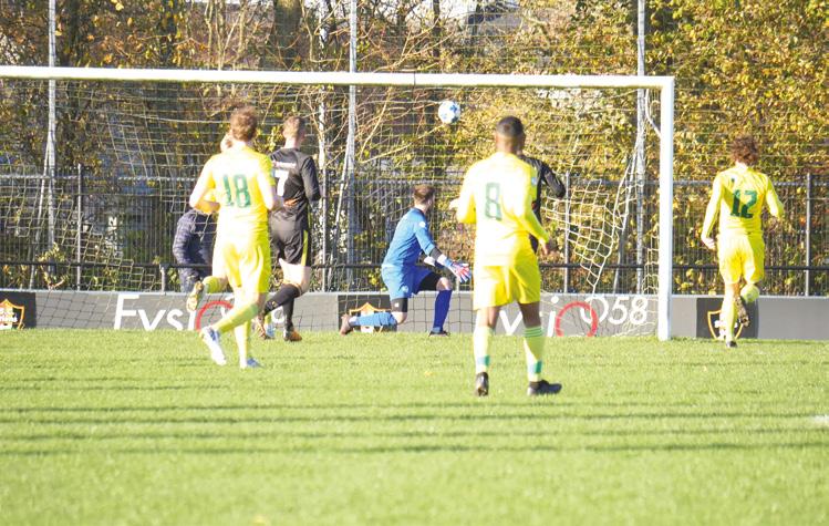 kerman aan, gretig ging deze naar het gras. Maar wel een terechte penalty, die laatst genoemde fraai benutte, 2-0. Nog geen twee mi nuten later werd een onachtzaam heid in de defensie strak afgestraft door Akkerman met een harde schuiver. Meteen hierna liet Theo Nota zich vervangen door Connor Bosman.