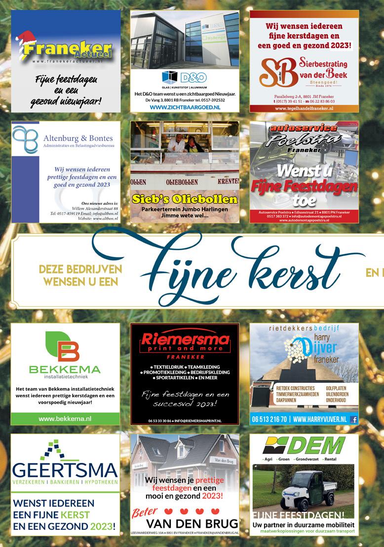 51 DE KRANT VAN FRANEKER, HARLINGEN, ST. ANNAPAROCHIE, DRONRIJP, BOLSWARD EN OMSTREKEN Rotary Club Franeker goedgevig Folgas hoopt op succes in Fryske Top 100 Nieuwjaarsduik Harlingen Kerstbrunch voor verbinding JAARGANG 25 | NUMMER 51 | 72 PAGINA’S 20 december 2022 Dikke douglas palen kun je nog steeds op bestelling bij Steenstra Tuinhout afhalen Regionieuws? redactie@vanwadtotstad.nl Kunststof Kozijnen MTD Kozijnen/Montage Seerob 34 -9051 VA Stiens Tel. 058-257 33 88 www.mtdkunststof.nl OPENINGSTIJDEN Maandag t/m zaterdag: 07.00 tot 22.00 uur Zondag: 12.00 tot 18.00 uur 1997 - 2022 25 JAAR 35 31 9 Al 25 JAAR het best gelezen blad van Noordwest Friesland! Valt dit op? Adverteren werkt. Neem contact op via mail info@vanwadtotstad.nl of bel 0517-343035 Gemeentenieuws vanaf p. 32