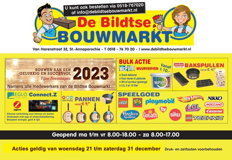 20 december 2022 1997 - 2022 25 JAAR Vindt u het een schande dat in Nederland voedselbanken nodig zijn? Maak jij je druk als veel jongeren niet op tijd hulp krijgen? Bent u bang dat door de digitalisering ouderen de weg naar hulp kwijtraken? VRIJWILLIGER VACATURE WIL JE GRAAG MET JOUW GEMEENTE IN GESPREK OVER DIT SOORT ONDERWERPEN? SAMEN STAAN WE STERKER! Maak het verschil! WORD LID VAN DE ADVIESRAAD SOCIAAL DOMEIN NOARDWEST FRYSLÂN INTERESSE? Heb je interesse en woon je in Harlingen, Waadhoeke, op Terschelling of Vlieland, kijk dan vooral even op www.asdnwf.nl/vacatures voor meer informatie. Daar lees je meer over deze vrijwilligersfunctie en over hoe je kunt solliciteren. Colkesyl 4 Minnertsga | Tel. 0518 - 471551 | info@hddevries.nl VOORJAAR! DE VRIES HEEFT HET AL VOOR U KLAAR. Steigerhout stunt Steigerplanken 5 meter slechts € 9,95 p/st. Steigerplanken 2,5 meter slechts € 5,00 p/st. Steigerhoutbeits wit en grijs €13,50 p/ltr. Gebruikte steigerplanken 5 mtr €18,00 p/st. Tuinplanken verduurzaamd 14 cm breed, 16 mm dik, Lengte 1,80/3,00/3,60/4,00 meter Slechts € 1,- per meter Palen verduurzaamd 7x7 cm Lengte 2,40 meter € 5,95 per stuk Vlonderhout verduurzaam 14,5 cm breed, 28 cm dik, Lengte 4,00 meter € 8,95 per stuk • Zand • Kalksteenblokken • Grind • Lijmen • Cement • Mortels • Metselsteen • Stucadoorsbenodigheden • Betonmatten • Multiplex etc Etc • Balkhout • Gipsplaten • CLS • Spanoplaten • Schroten / panlatten • Underlayment • Isolatiemateriaal • OSB platen • Multiplex • etc etc Tuinhout Alles voor de (aan)bouw! Alles voor de (binnen)klus! Voor picknicktafels groot en klein moet u in Minnertsga zijn Diverse PVC materialen zoals buizen, koppelingen, beugels, etc. Gipsplaten, plaatmaterialen, balkhout etc. etc. (elektrische) greedschappen, ijzerwaren, schroeven etc. • Propaan Butaan Campinggas Voor heftruck Voor lassen diverse verpakkingen gebruik van aanhangwagen Nu ook gasflessen De Tuin in! • Tuingereedschap • Kunstmest • Graszaad • Siergrind • Bestratingsmateriaal • Zand & Grind • Etc ect… www.hddevries.nl OOK IN HET NAJAAR STAAN WE VOOR U KLAAR. VOOR EEN GOED KLUSADVIES DUS NAAR DE VRIES. Ook voor tuinaanleg! Tuingereedschap Pallisadeblokken Tuinschermen Siergrind Bestratingsmateriaal Zand & Grind Etc. ect Bij aankoop van bouwmaterialen Wij wensen u fijne feestdagen. Ook volgend jaar staan we graag met raad en daad voor u klaar! ddevries.nl HEEFT VOOR etc. NAJAAR VOOR U EEN KLUSADVIES VRIES. van len NAJAAR VOOR U EEN KLUSADVIES VRIES. van alen NAJAAR VOOR U EEN KLUSADVIES VRIES. Steigerhout stunt Steigerplanken 5 meter slechts € 18,50 p/st. Steigerplanken 2,5 meter slechts € 9,25 p/st. Steigerhoutbeits wit en grijs €15,95 p/ltr ddevries.nl etc. NAJAAR U EEN ES VRIES. n en etc. NAJAAR U EEN ES VRIES. etc. NAJAAR U EEN ES VRIES. n Tuinhout Tuinplanken verduurzaamd 14 cm breed, 16 mm dik, diverse lengtes o.a 1,80/3,00/3,60/ 4,00, 5,00 meter Palen verduurzaamd 7x7cm diverse lengtes vanaf 2,40 meter Hardhouten palen div. lengtes. o.a 2,50/2,75/3,00 meter Vlonderhout verduurzaam 14,5 cm br eed, 28 mm dik, lengte 3,00/4,00/5,00 meter Voorjaar, de tuin in! • Tuingereedschap • Pallisadeblokken • Tuinschermen • Siergrind • Bestratingsmateriaal • Zand & Grind • Graszaad • kunstmest • Etc. ect Alles voor de (binnen)klus! • Balkhout • Gipsplaten • CLS • Spanoplaten • Schroten / panlatten • Underlayment • Isolatiemateriaal • OSB platen • Multiplex • etc etc Alles voor de (aan)bouw! • Zand • Kalksteenblokken • Grind • Lijmen • Cement • Mortels • Metselsteen • Stucadoorsbenodigheden • Betonmatten • Multiplex etc. Etc. Extra zwaar model Nu € 225,00