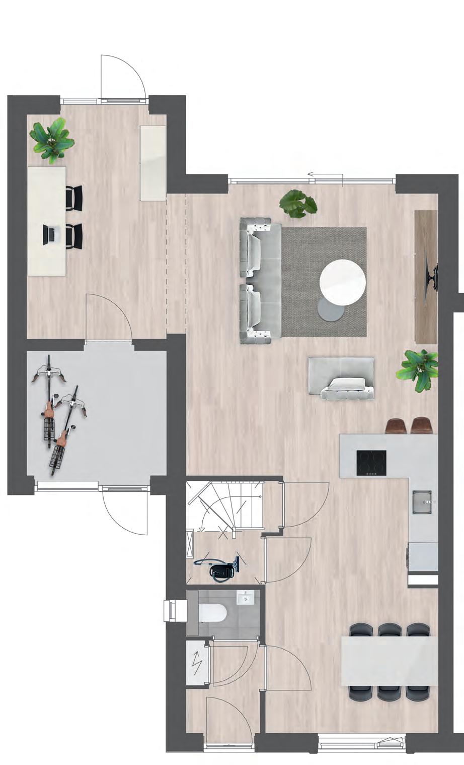 Deze flyer is bedoeld om de sfeer en de mogelijkheden van dit project te laten zien. De in deze flyer aangegeven keuken, huishoudelijke apparaten en inrichting c.q. aankleding geven een impressie van de mogelijkheden en behoren niet tot de standaard uitrusting van de woning. De juiste positie van elektra/ schakelmateriaal, rookmelders, afzuigpunten t.b.v. ventilatie e.d. staan op de verkooptekeningen vermeld en zijn niet in de plattegronden opgenomen. Aan de beelden, illustraties, plattegronden en teksten in deze flyer kunnen geen rechten ontleend worden.