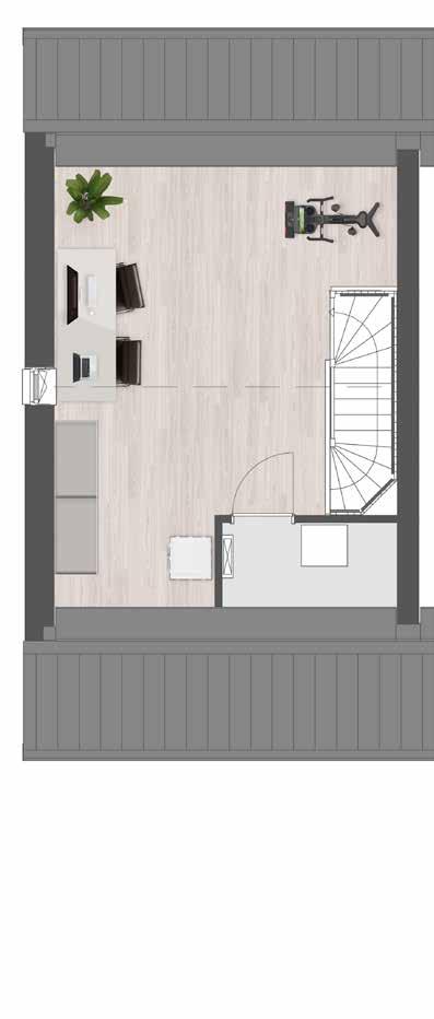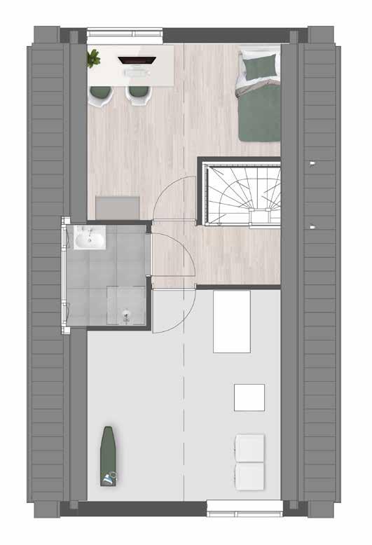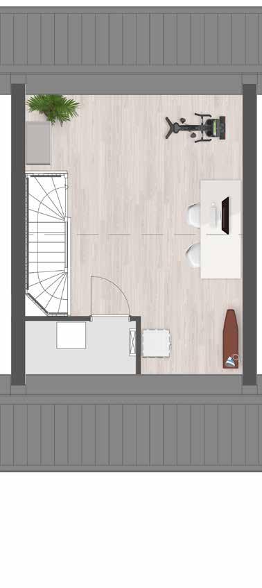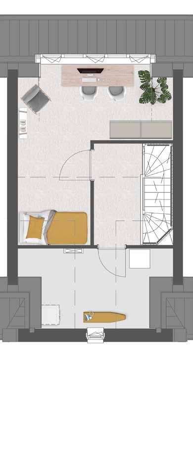 Op de zolder zijn de technische apparatuur (omvormer en warmtepomp) en de aansluitingen voor wasmachine en droger) netjes weggewerkt in een aparte ruimte. Daardoor kan de zolder ook zonder dat er een vierde slaapkamer is gemaakt toch dienen als logeerruimte. “In de toekomst gaan we hier misschien nog wel eens een dakkapel plaatsen, maar voorlopig hebben we ruimte genoeg.”
