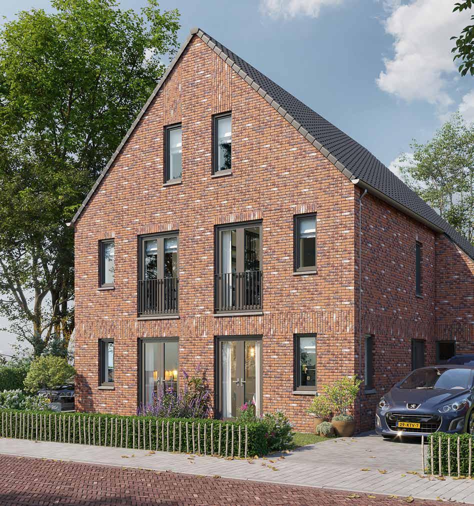 Verder hebben we alle woningen voorzien van gevarieerd metselwerk. Dus met rolkragen, allerlei metselverbanden, verticaal en horizontaal, en met verschillende kleuren baksteen. Ook hebben we in de sommige gevels penanten aangebracht om een verdieping te creëren in het gevelbeeld. Of de zijgevels zijn hoger opgemetseld en een kap is gedraaid. Samen met de Franse balkonhekjes ontstaat zo veel variatie in het gevelbeeld en zo ontstaat voor elke bewoner een eigen ‘thuis’.