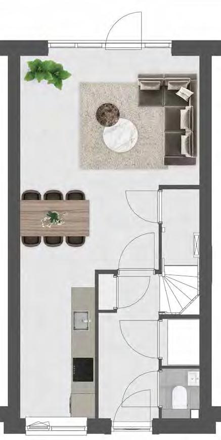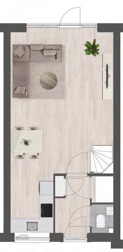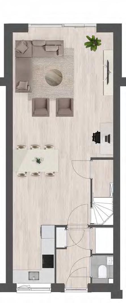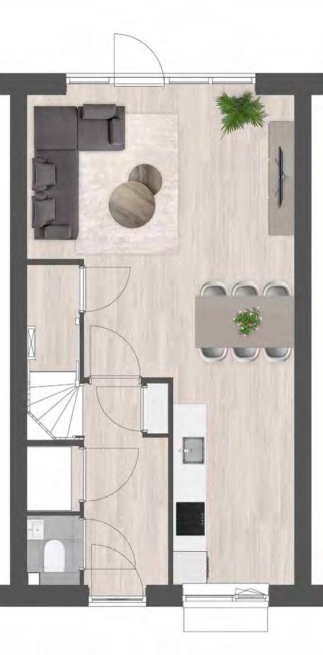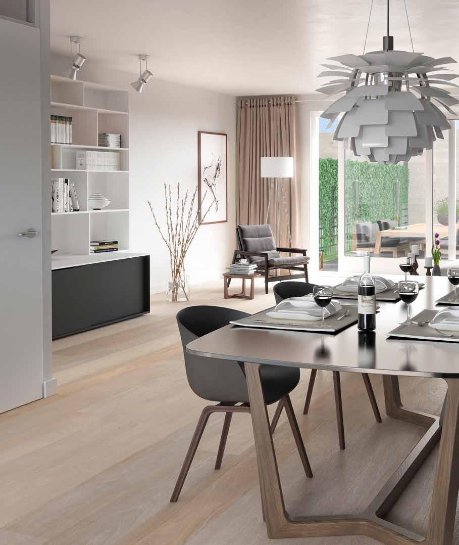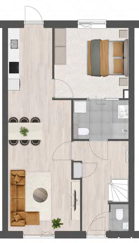 Standaard het volledig woonprogramma met slaapkamer en badkamer op de begane grond Mogelijkheid om indeling te wijzigen voor extra veel leefruimte; slaapkamer verplaatsen naar de verdieping en deze ruimte als extra ruime woonkamer te gebruiken