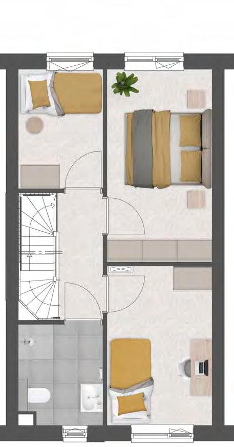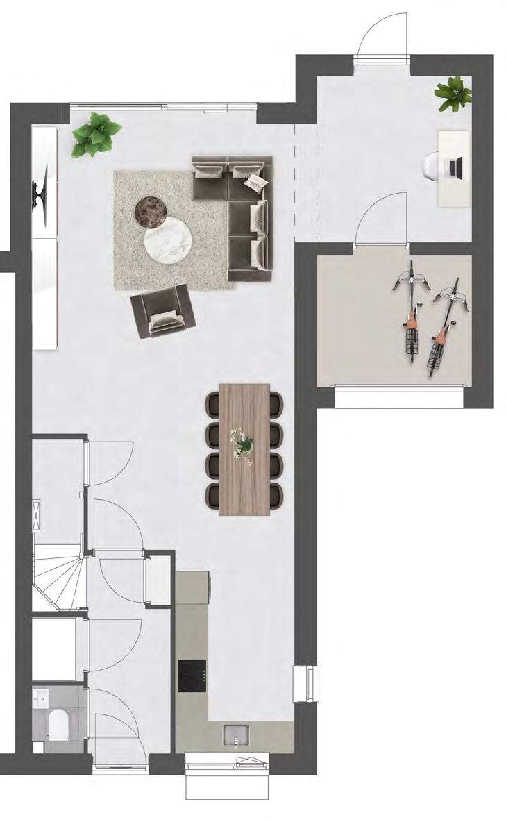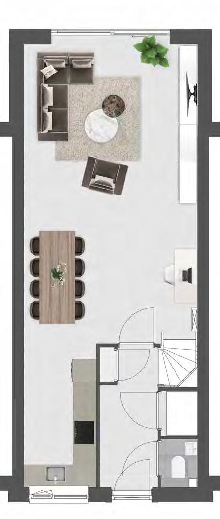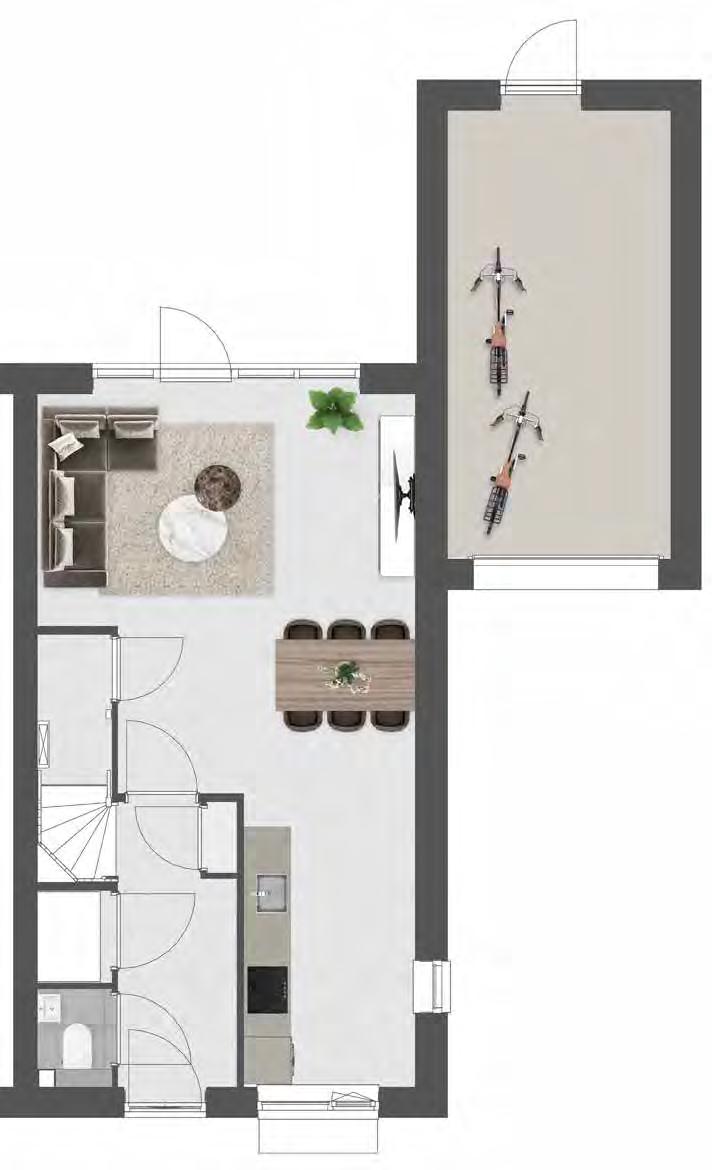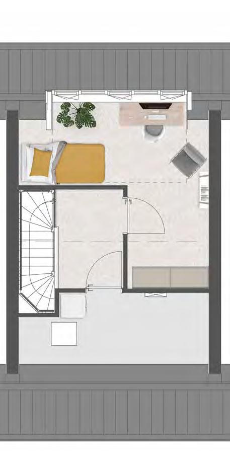 Standaard het volledig woonprogramma met slaapkamer en badkamer op de begane grond Mogelijkheid om indeling te wijzigen voor extra veel leefruimte; slaapkamer verplaatsen naar de verdieping en deze ruimte als extra ruime woonkamer te gebruiken