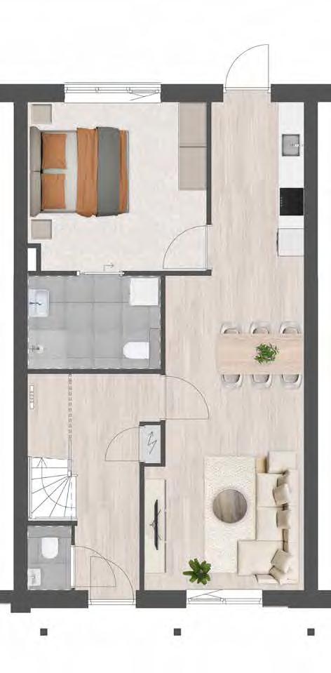 • Volledig woonprogramma met keuken, woonkamer, slaapkamer en badkamer op begane grond