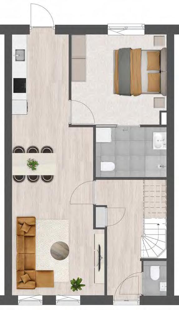 Volledig woonprogramma met keuken, living, slaapkamer en badkamer op begane grond