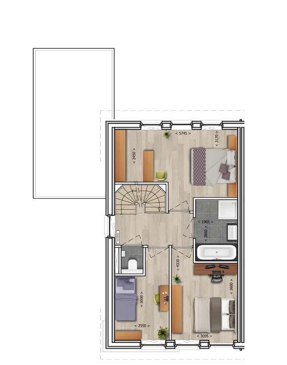 • Indeling zolder (met wasruimte/technische ruimte, overloop en (slaap-) kamers.