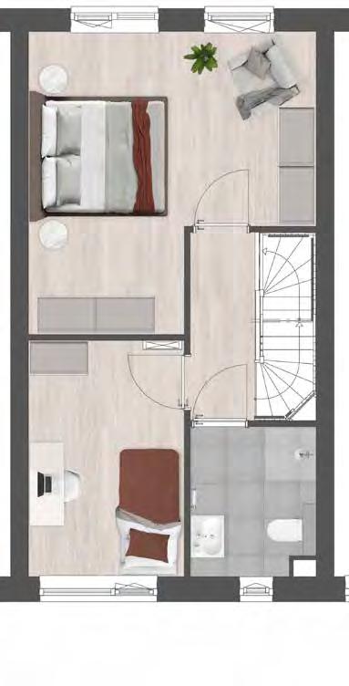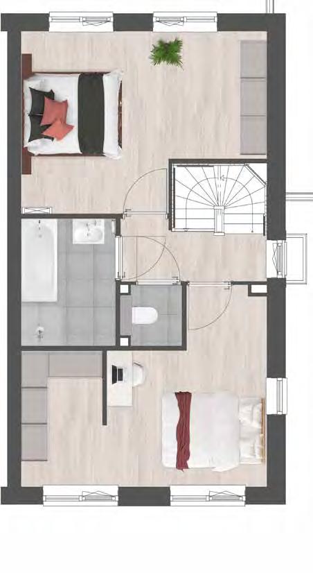 • Indeling met standaard overloop, 2 (slaap)kamers en bergruimte