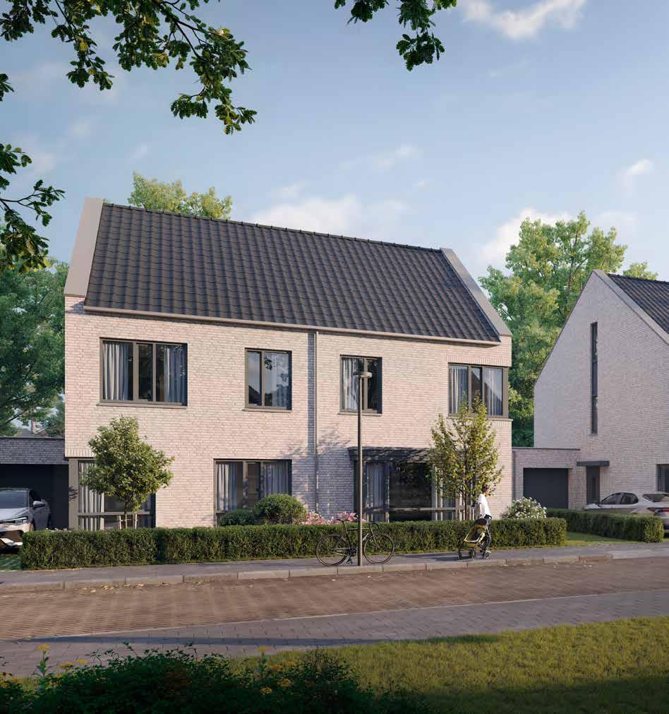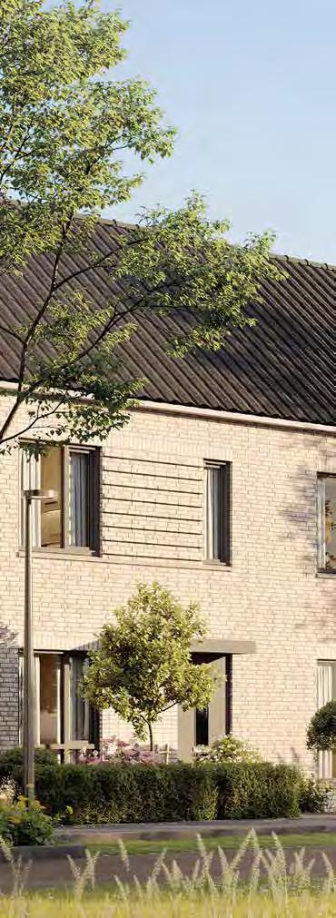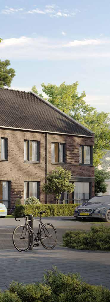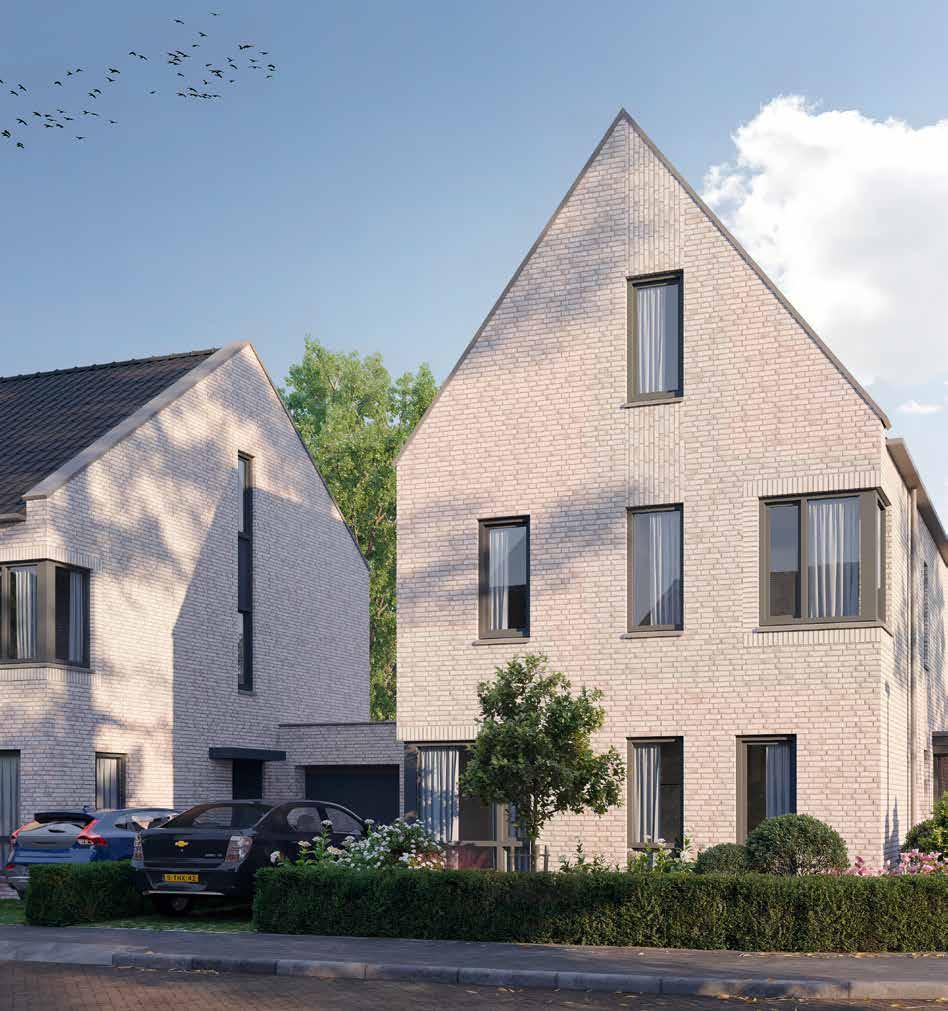 Alle woningen hebben een voortuin en liggen ruim in een natuurlijke setting met bomen en groen. Daarom hebben we gekozen voor een lichte, natuurlijke steenkleur. Dat versterkt ook de moderne uitstraling van deze woningen. Die vind je ook terug in de kleur van de strakke kozijnen.