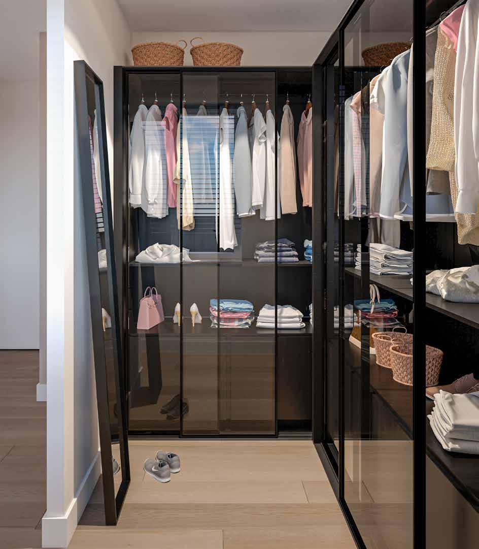 De hele woning is voorzien van mooie houten paneeldeuren. Ook boven hebben Linda en Bert alle mogelijkheden benut om meer ruimte te creëren. De badkamer is groter gemaakt en biedt plaats aan een dubbele wastafel, een ligbad én een zeer ruime inloopdouche. Standaard telde deze etage drie slaapkamers, maar twee kamers zijn hier samengevoegd tot één masterbedroom van vorstelijke omvang. Een bijzondere oplossing is gevonden voor het ophangen van de flatscreen: een soort roomdivider in het midden van de kamer; de andere zijde ervan biedt plaats aan de spiegel. ”Dat was een leuk idee van onze kopers begeleider”, zeggen Linda en Bert.