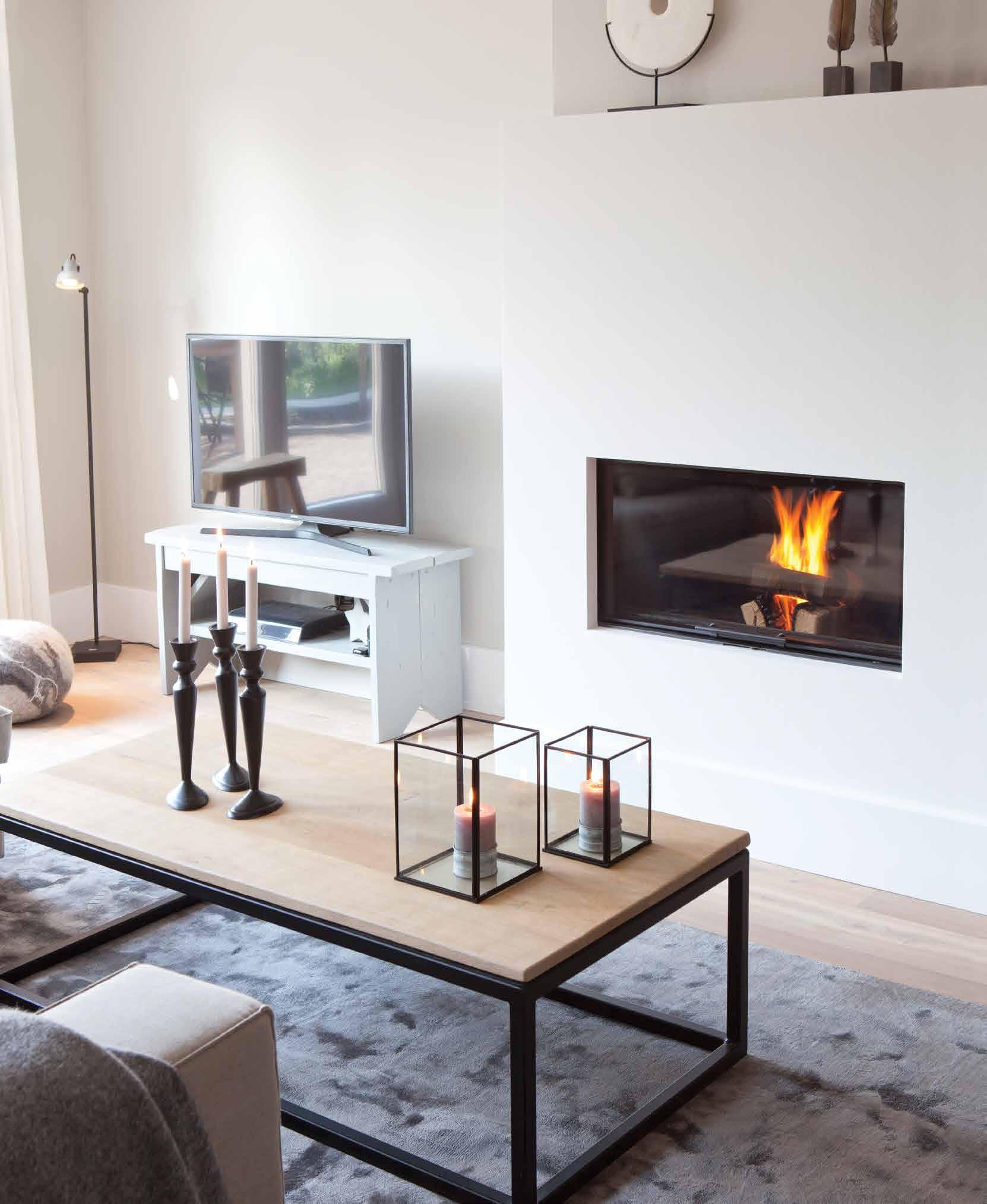 De brede, gesloten haard biedt sfeer en gezelligheid in de zithoek aan de tuinzijde. Een gashaard was hier niet mogelijk, omdat de woning niet op het gasnet is aangesloten. “Maar we konden deze haard wel in laten bouwen. Dat is natuurlijk heel sfeervol voor de donkere winteravonden.” Heel donker zal het niet gauw zijn in deze kamer met vooral lichte tinten, voorzien van een enkel accent. Mede dankzij de uitbouw van 2,40 meter is hier leefruimte te over.