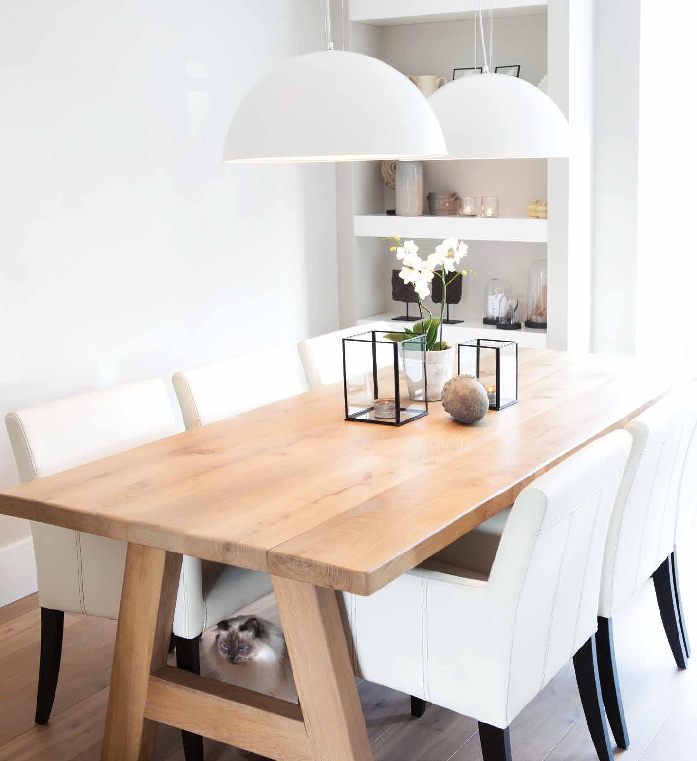 De massief houten eettafel is op maat gemaakt en staat in het keu kengedeelte van de begane grond, aan de straatkant van de woning. “Op die manier hebben we daar alles bij elkaar, waardoor een fijne leefkeuken is ontstaan, terwijl we de zithoek aan de tuinzijde hebben.”
