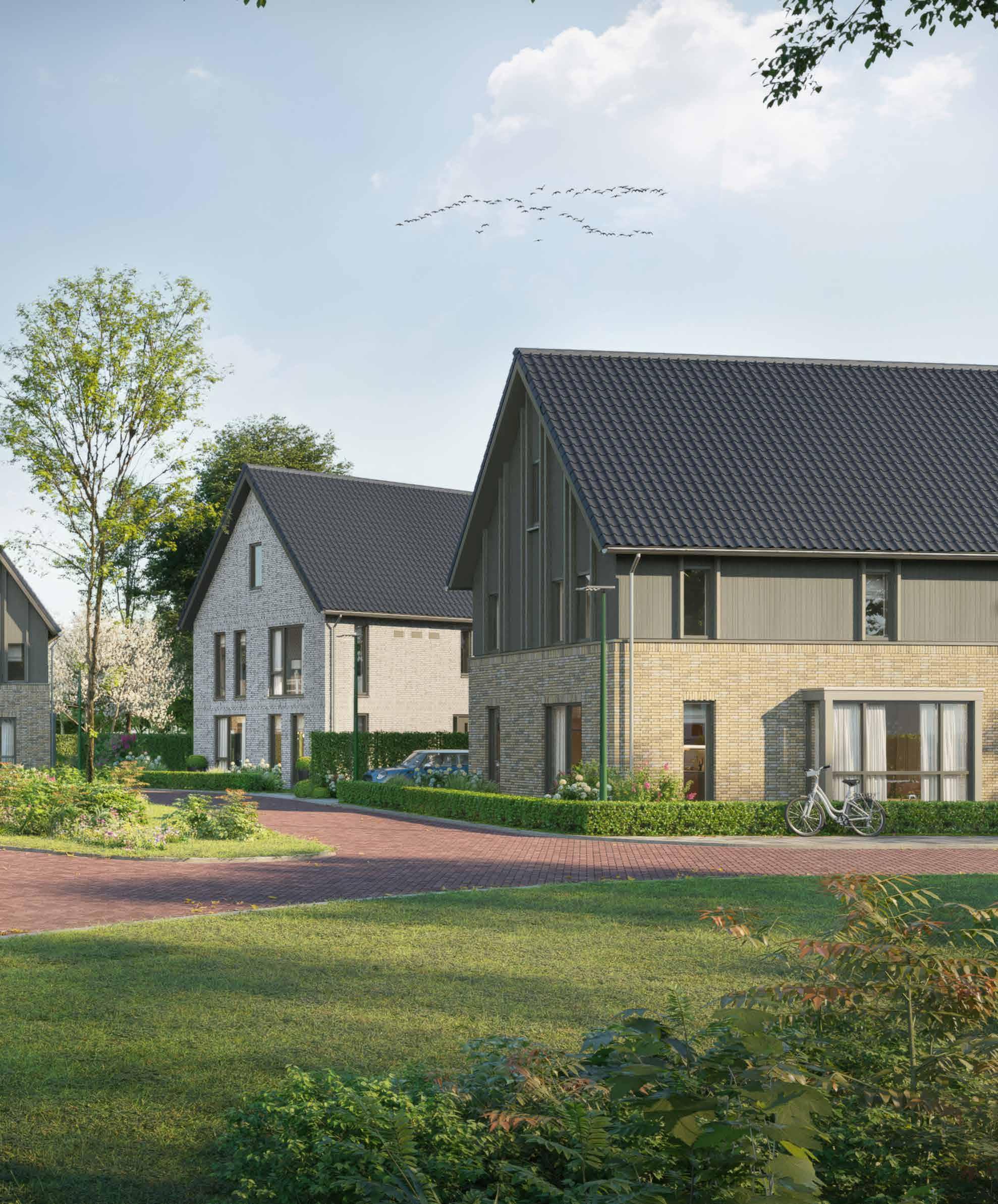 Met het gebruik van natuurlijke materialen willen we het landschappelijke karakter van het gebied behouden. Deze uitstraling wordt versterkt door de ruime tuinen, de groene erfgrenzen en de parkachtige inrichting van het openbaar gebied. Aan de randen van de wijk komen groensingels met ruimte voor bestaande bomen en in de gevels van de woningen zijn nestkasten opgenomen. Dit alles geeft een gevoel van ruimte, en draagt bij aan een vriendelijke en natuurinclusieve wijk.