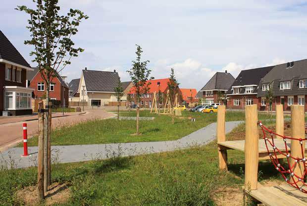 Grote raamopeningen brengen veel licht in de woning en geven uitzicht op de zorgvuldig en sfeervol vormgegeven openbare ruimte. De voortuinen worden netjes afgewerkt door hagen. Er is maximaal contact tussen de woningen en de straat, waardoor kinderen veilig kunnen spelen en er ruimte is voor spontane ontmoeting, allemaal erg dorps.