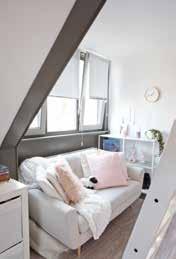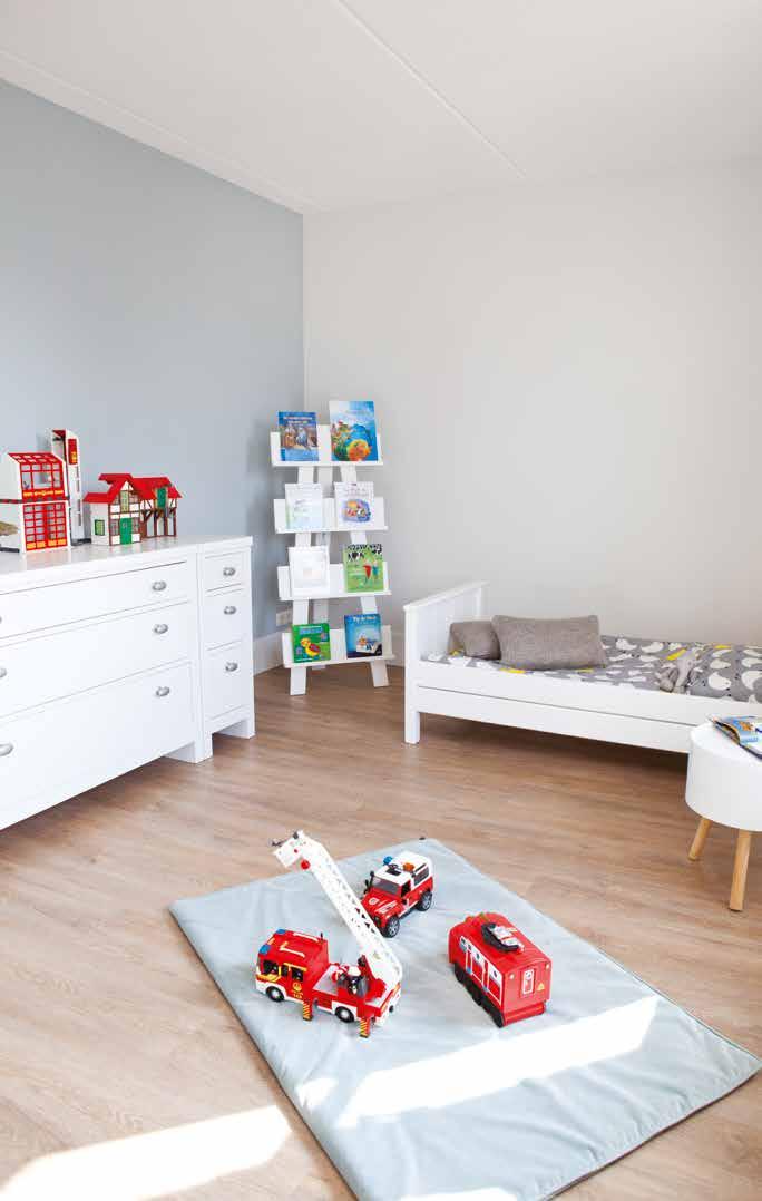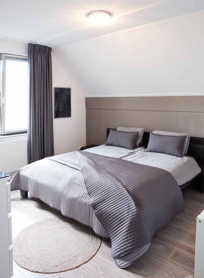 Voor de slaapkamers heeft de familie gekozen voor rustige, neutrale kleuren met houtlaminaat op de vloeren. Op de zolderslaapkamer biedt de dakkapel plaats aan een zitbankje. En dankzij de hoogslaper kan hier ook gewerkt worden. De badkamer - met inloopdouche, dubbele wastafel en toilet - is eveneens uitgevoerd in een overwegend lichte kleur, met donkergrijze vloertegels. “We hebben eigenlijk zo’n beetje alles bij Van Wanrooij in het Warenhuys gekocht. Dat is toch makkelijk, je hebt alles in één, je hebt één aanspreekpunt en ze kunnen alles goed laten zien in die fraaie showroom. We zijn super tevreden.”