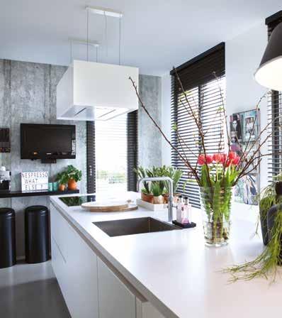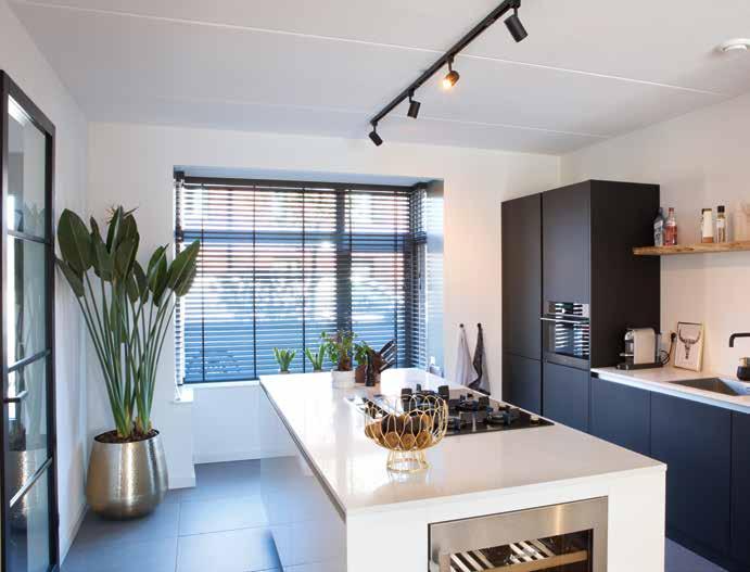 In de keuken kozen zij voor iets meer contrast: een wit kookeiland met op de kopse kant een wijnklimaatkast en tegen de wand een zwarte kast met veel bergruimte, een magnetron en een wit aanrechtblad en spoelbak. Op de vloer lichte grijze keramische tegels. Met bamboe shutters in de erker kunnen ze het daglicht naar wens regelen. De stalen deur met grote glasvlakken zorgt in de woning voor een extra ruimtelijke indruk.
