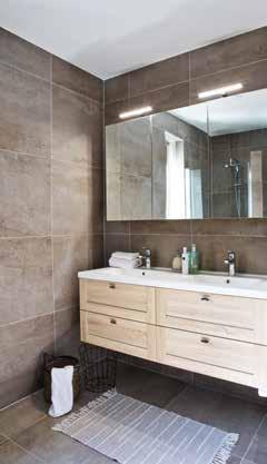 Op de eerste verdieping lieten Jeroen en Kristy de badkamer iets vergroten voor een wat ruimere inloop-regendouche, een toilet en een houten badkamermeubel met dubbele wasbak. De witte en lichtbeige tegels zorgen dat het licht en ruimtelijk oogt. Verder zijn er op de eerste etage drie slaapkamers en de zolderruimte is ingericht als privé “sportschool”.