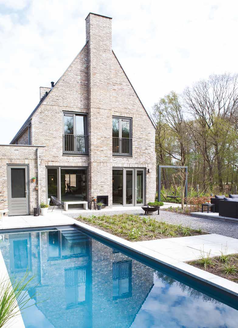 Aan de achterzijde van de woning is het niet alleen relaxen geblazen op de loungebanken of gezellig tafelen aan de ‘betonnen’ eethoek. Er kan ook gesport en gespeeld worden in het zwembad van 4 bij 9 meter. “Dat was vooral een wens van mij”, vertelt Sylvia, “ik ben wedstrijdzwemster geweest en ik ben graag in het water. Voor ik ’s middags onze jongste zoon uit school ga halen, heb ik er vaak al 70 baantjes opzitten.” Voor de kinderen is zo’n zwembad natuurlijk ook heerlijk.