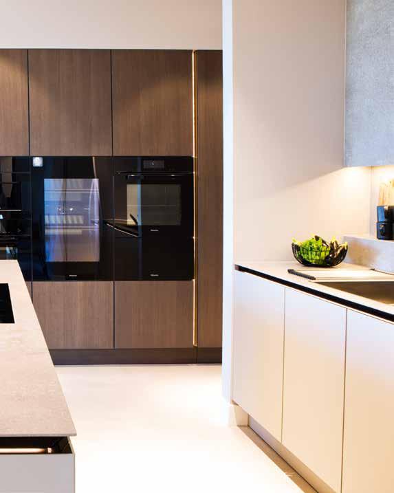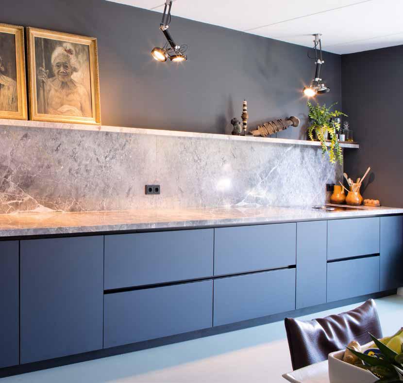 De matzwarte keuken is maar liefst 6,6 meter lang geworden met een werkblad en achterwand van Fiore di Bosco marmer en een Bora inductiekookplaat met geïntegreerde afzuiging. Voor de verlichting van het werkblad zijn industriële spots van Modular toegepast. Tegen de wand tussen keuken en zithoek is een groot wandmeubel met oven, magnetron en bergruimte geplaatst. Daarnaast staat een losse ijskast met dubbele deur.