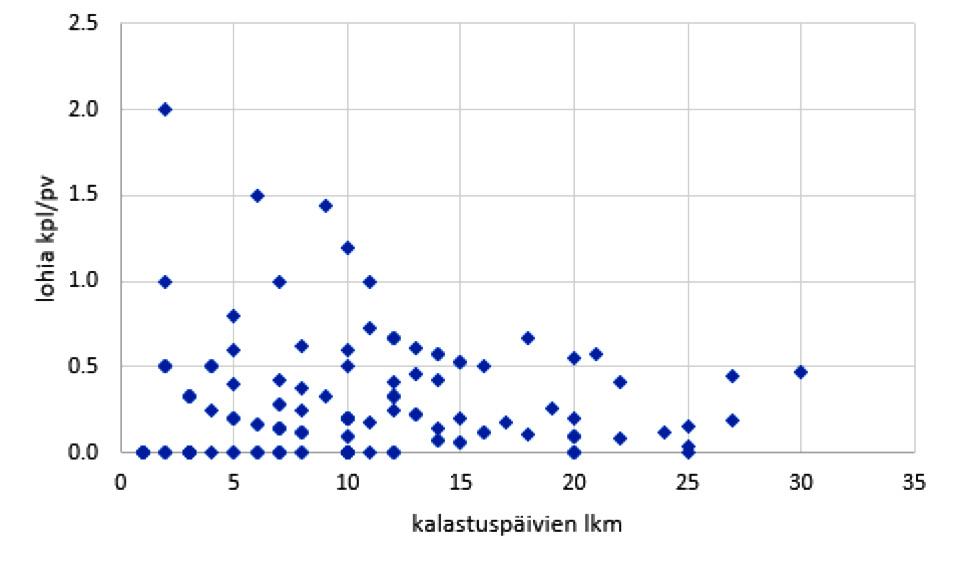 (Vastaa kalastuspäivien lukumäärä ja lisääntyikö vai vähentyikö kalastus).
