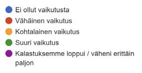 Vaihtoehtoina: Ei ollut vaikutusta / Vähäinen vaikutus / Kohtalainen vaikutus / Suuri vaikutus / Kalastuksemme loppui-väheni erittäin paljon