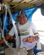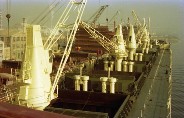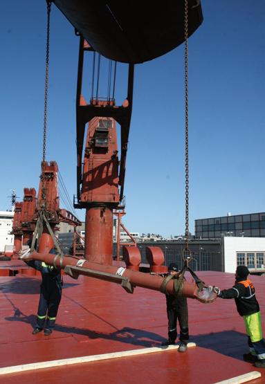 Försti Antero Virtanen ja perämies Tommi Tuominen ovat kansimiesten kanssa nostohommissa. Päällikkö Hautalan mukaan laivalla ei juurikaan katsota jobin perään. Kannella tehdään töitä yhdessä. Varsinkin ruumajobeissa tarvitaan väkeä. Spanttien välit joudutaan puhdistamaan ”käsikorttauksella”.