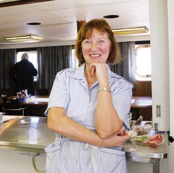 Isossa laivassa on iso keittiö. Kokkistuju Kjell Lindqvist ja talousapulainen Tuula Stenström pitävät suuren aluksen tunnelmasta. Kontula tekee ainakin nykymittapuun mukaan pidempiä matkoja, jolloin porukka pääsee ”meren rauhaan”.