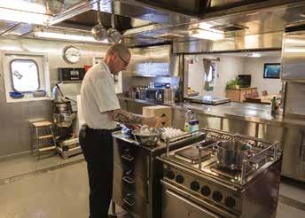 Satamahinaustyössä aluksella ei ole kokkia. Ruoholahdessa on mukava käydä lounaalla esimerkiksi Salvessa tai Nosturissa. Usein ruoka valmistetaan kuitenkin itse. Vapaavahdin vierailun aikana byssavuorossa oli YT-mies Janne Saarinen, joka edustaa hankolaista Saaristen hinaajasukua.