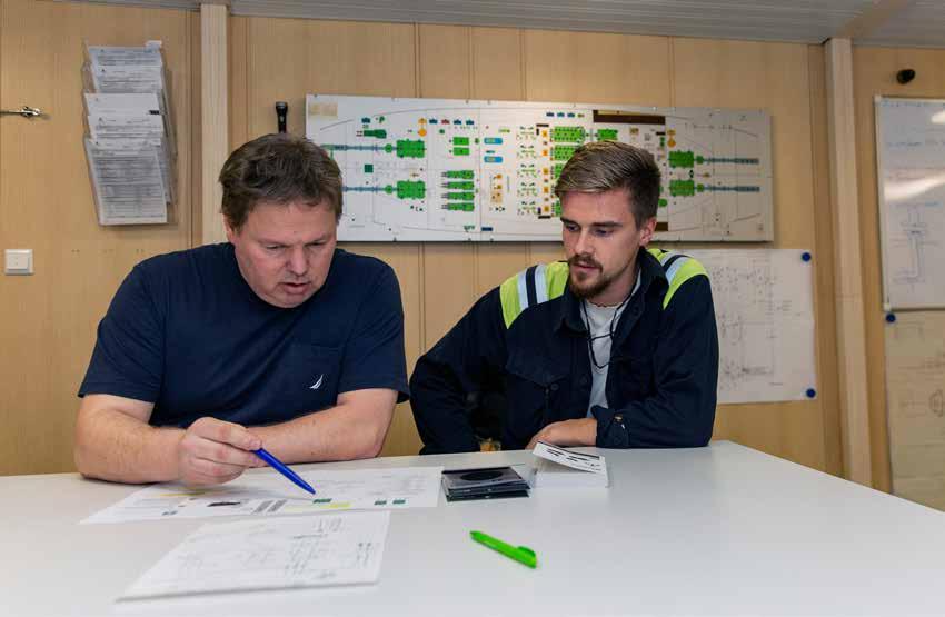 Sähkömestari Jaani Ristiluoma ja sähkömies Markus Matilainen suunnittelivat kaukolämpöpumpun vaihtoa J/M Sisun konetoimistossa.