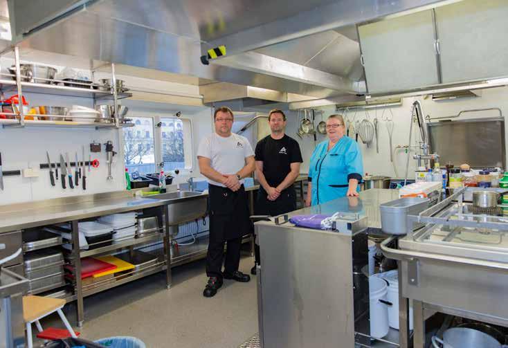Det kan komma uppemot 140 matgäster per dag från de andra isbrytarna och kontoret. Cateringen sköts av fem personer, varav tre arbetar i köket. Lasse kom till huset från passagerarfartygen 2005 och har efter Aranda seglat med Nordica och Urho.