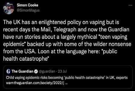In seinem Artikel auf The Snowdon Substack demontierte er eine Geschichte, in der behauptet wurde, dass eine „schattenhafte“ Vape-Industrie Geräte auf dem Schwarzmarkt einschmuggelt, um Kinder zu beeinflussen. Er sagte: „Wenn man Nachrichten aus ‘Down Under’ liest, könnte man meinen, das Land sei vom Rest der Welt abgeschnitten … man kann nur darüber lachen“.