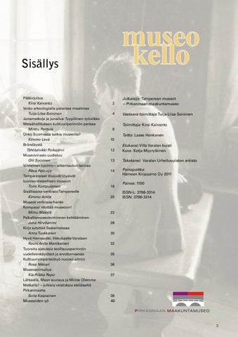Sisällys Pääkirjoitus Kirsi Kaivanto Voiko arkeologialla parantaa maailmaa Tuija-Liisa Soininen Junamatkoja ja junailua: Tyypillinen työviikko Metsähallituksen kulttuuriperinnön parissa Minttu Perttula Onko Suomessa turhia museoita? Kimmo Levä Brändäystä Tähtitalvikki Poikajärvi Museovirasto uudistuu Olli Soininen Viimeinen tuomio – alttaritaulun tarinaa Ritva Palo-oja Tamperelaiset löysivät löysivät luonnontieteellisen museon Tomi Kumpulainen Sisällissota-verkosto Tampereelle Kimmo Antila Museot verkossa-hanke Kompassi näyttää museoon! Miinu Mäkelä Paikallismuseotoiminnan kehittäminen Juha Hirvilammi Kirja sytyttää Sastamalassa Anna Tuukkanen Hyvä Herrasväki, liikkukaatte Varalaan Rauni Anita Martikainen Tuoreita ajatuksia teollisuusperinnön uudelleenkäytöstä ja arvottamisesta Kulttuuriympäristötyö nuoren silmin Rosa Nikkari Museosolmuilua Kia-Riikka Repo Lähteellä, Maan siunaus ja Minne Olemme Matkalla? – julkisia veistoksia eteläiseltä Pirkanmaalta Soila Kaipiainen