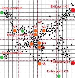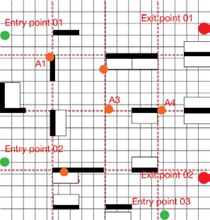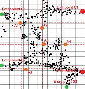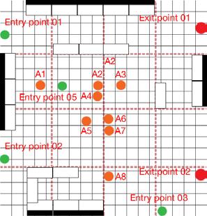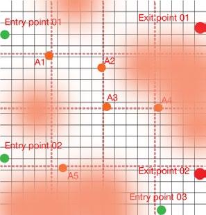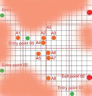 Scenario 01 - The market - The dataset points—attraction, entry, and exit—have been strategically defined based on observed movement patterns. By combining this simulation data with computational optimization, the system generates an efficient wall placement strategy that prioritizes usability while also ensuring adaptability for future scenarios. Leveraging machine learning algorithms, the solution enables automated simulations, seamlessly bridging digital and physical environments to create a responsive and future-ready spatial configuration.