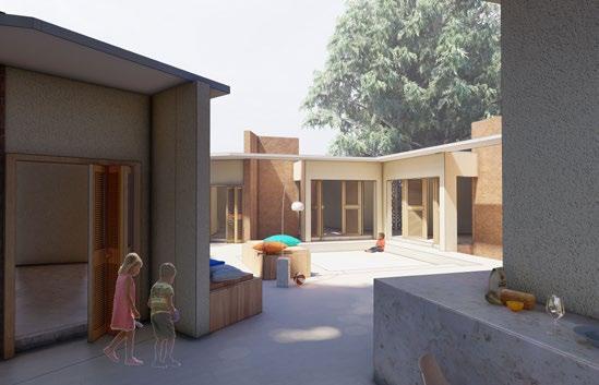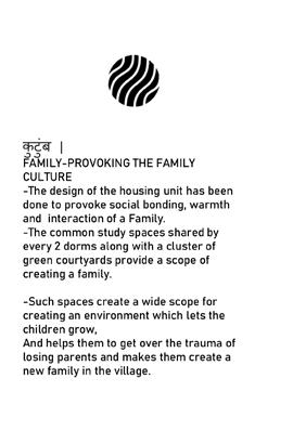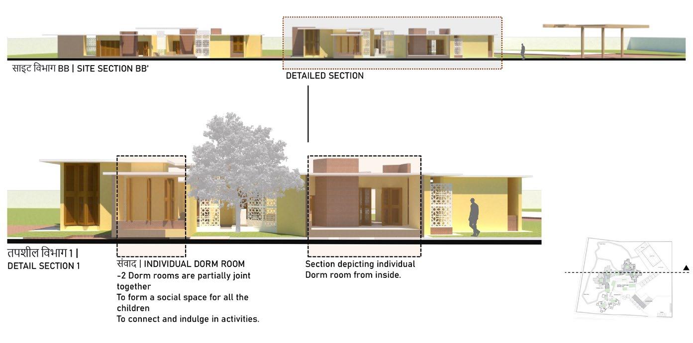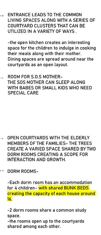 DORM ROOMSEach dorm room has an accommodation for 4 childrenwith shared BUNK BEDS creating the capacity of each house around 16.2 dorm rooms share a common study space.the rooms open up to the courtyards shared among each other. OPEN COURTYARDS WITH THE ELDERLY MEMBERS OF THE FAMILIESTHE TREES CREATE A VARIED SPACE SHARED BY TWO DORM ROOMS CREATING A SCOPE FOR INTERACTION AND GROWTH.
