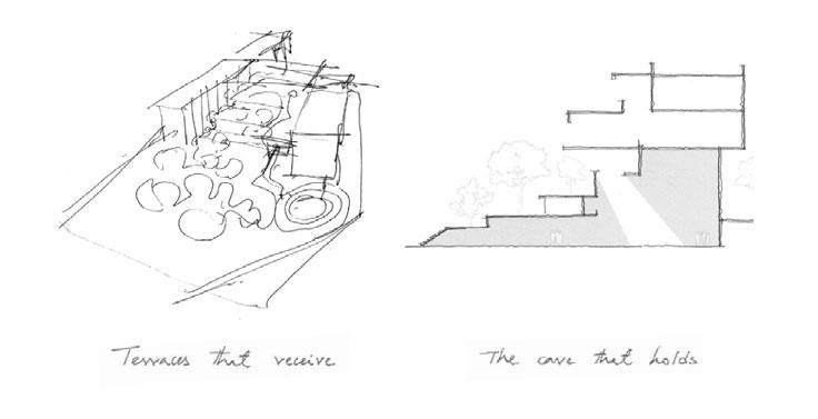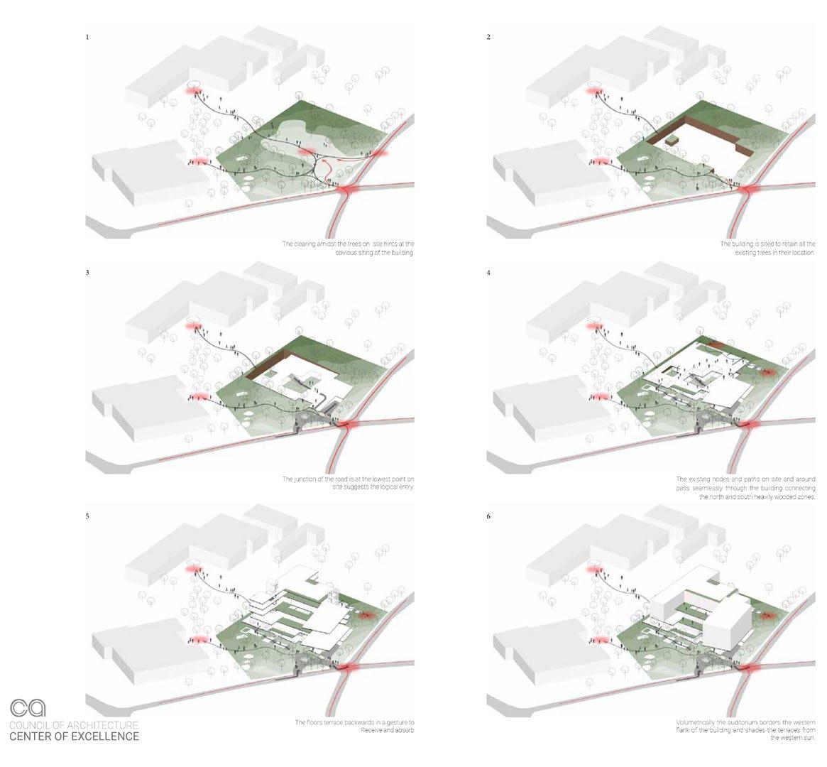 Owing to the fact that the buildable the area without trees is towards the center of the land parcel and constitutes a small footprint in relation to the otherwise large but un available land. Considering this aspect and the volume required to house the varied nature of the program lent to the initial idea of a dense labyrinth.The sloping terrain presents us with the opportunity burrow partially into this landscape. This led to The idea of a cavernous space housing the variety of spaces required for the diverse set of activities. The unifying nature of this idea bringing together the variety posits a participative and a multidisciplinary environment crucial to the premise of center for excellence.