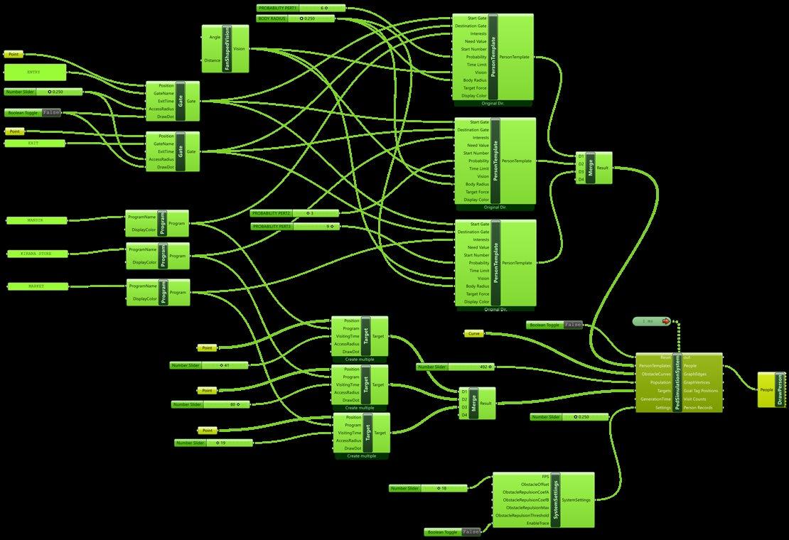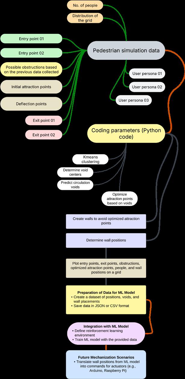The integration of ephemeral components, as outlined earlier, plays a pivotal role in creating spatial and physical setups that are not only economical but also versatile and user-friendly across various use cases. This computational exploration leverages PEDSEM-based Grasshopper simulations to analyze and optimize spatial configurations. By defining critical parameters—such as entry and exit points, attractions, and deflection zones—the system efficiently determines the optimal positions for movable walls. This approach mechanizes spatial adaptability, transforming the built environment into a dynamic, responsive entity that behaves almost like a living organism, adapting seamlessly to changing scenarios.