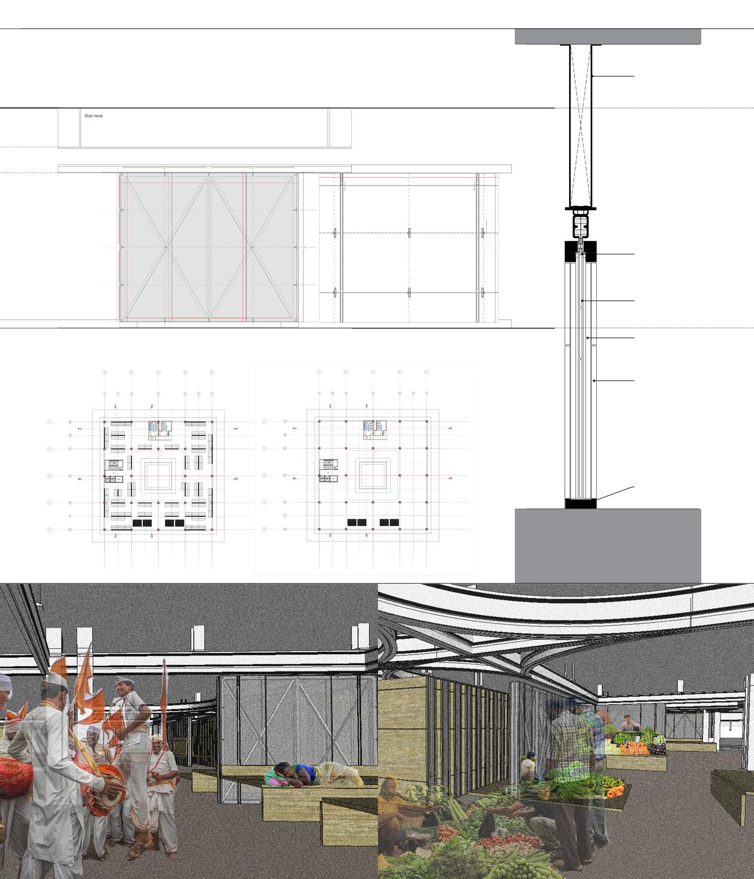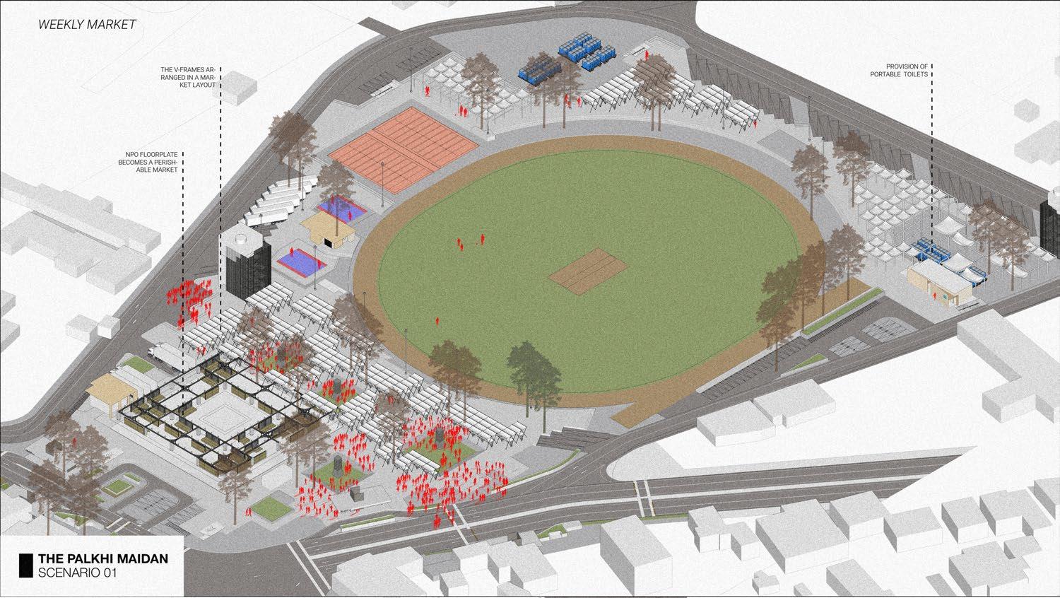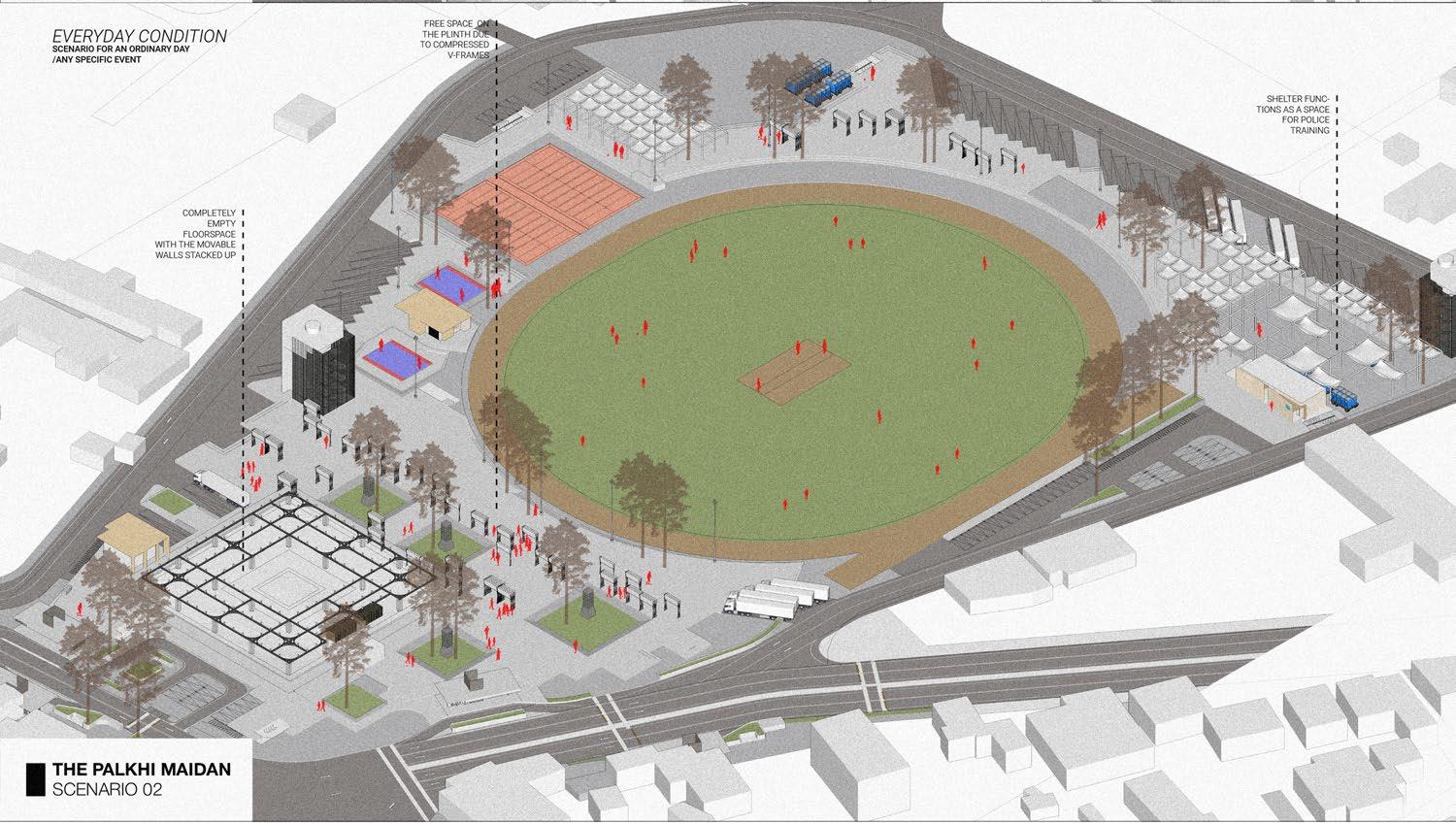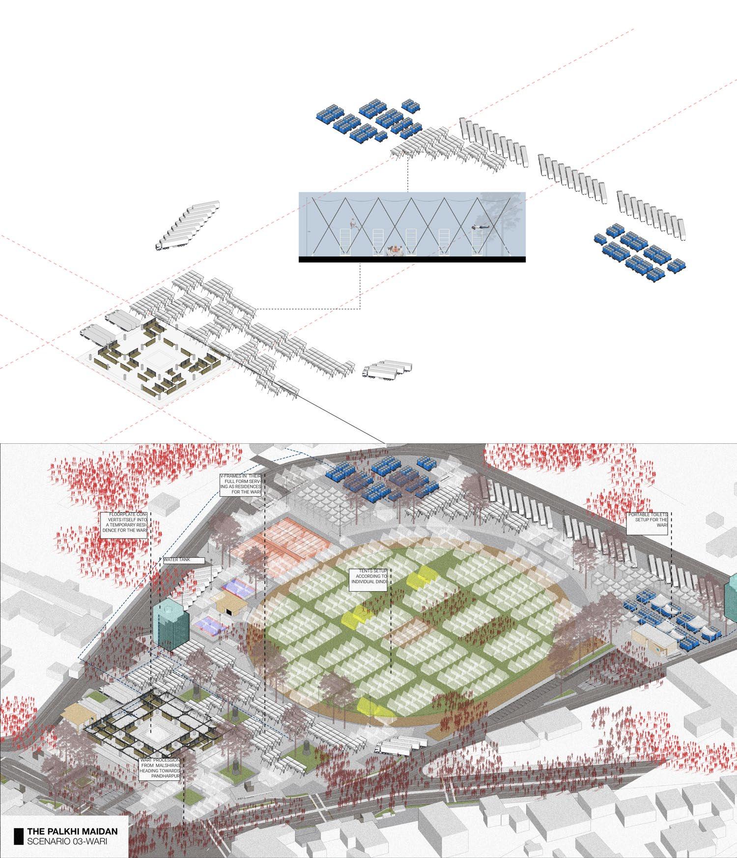 Based on site-specific data, analysis, and simulations, the following sketches and drawings showcase design experiments for various annual scenarios, such as: 1. Velapur plinth conditions during the annual sports festival, 2. Conditions during the Wari procession, and more.